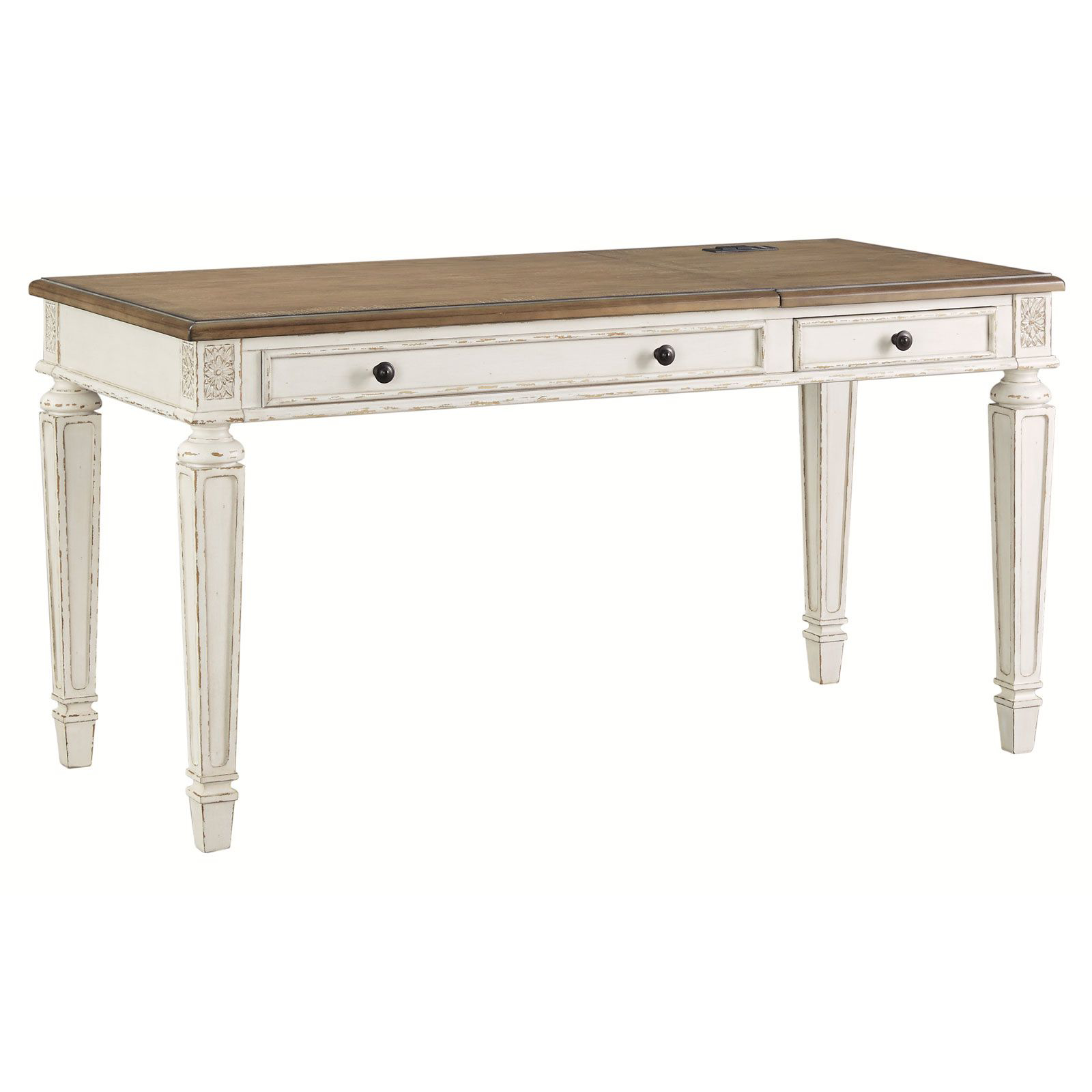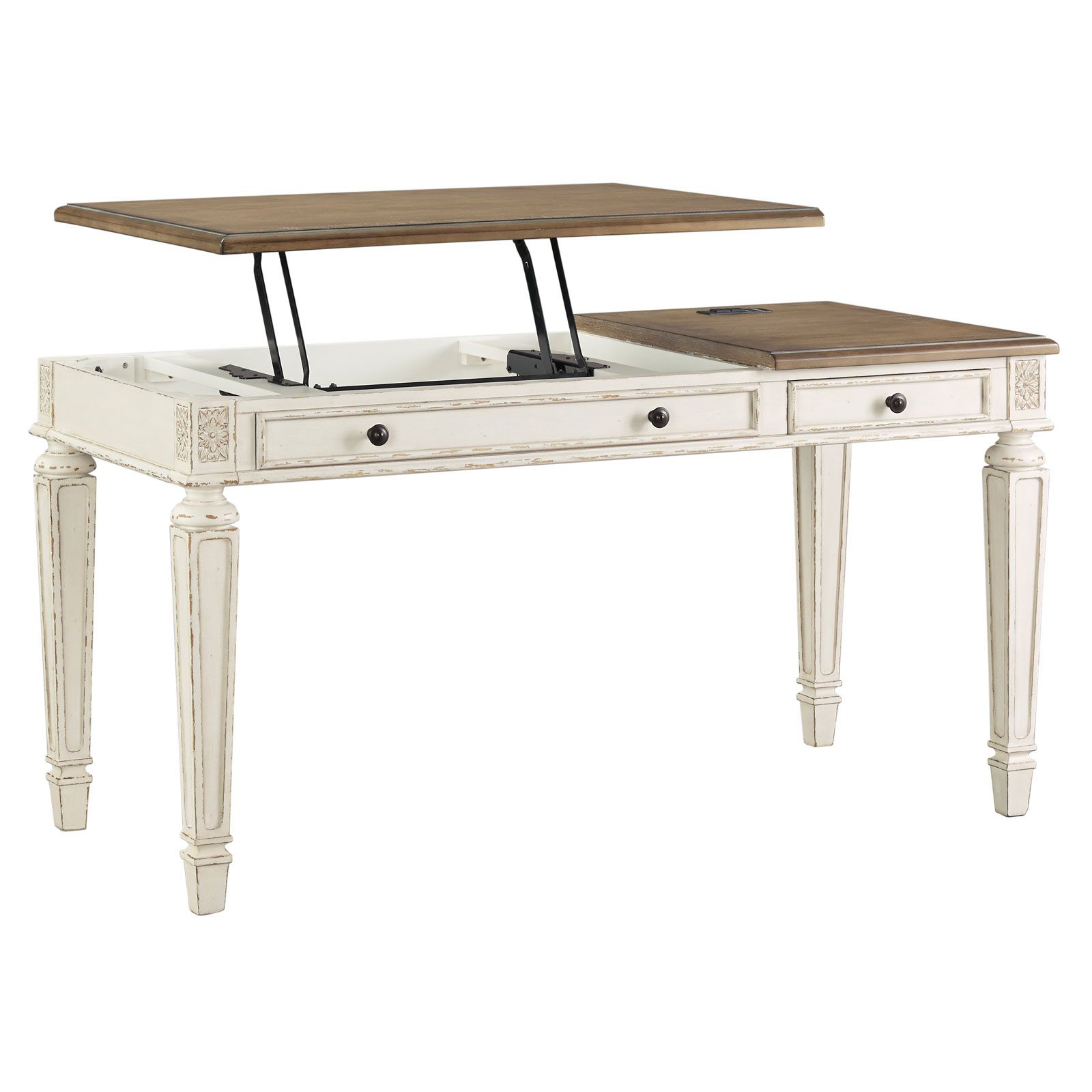 Fresh, modern take on cottage styling and updated functionality makes the Realyn desk perfect for your home office. The top lifts up to a comfortable standing position supported by sturdy springs. Get the best of both worlds by working sitting or standing. Drawers, USB ports and power supply in the table top offer additional convenience.