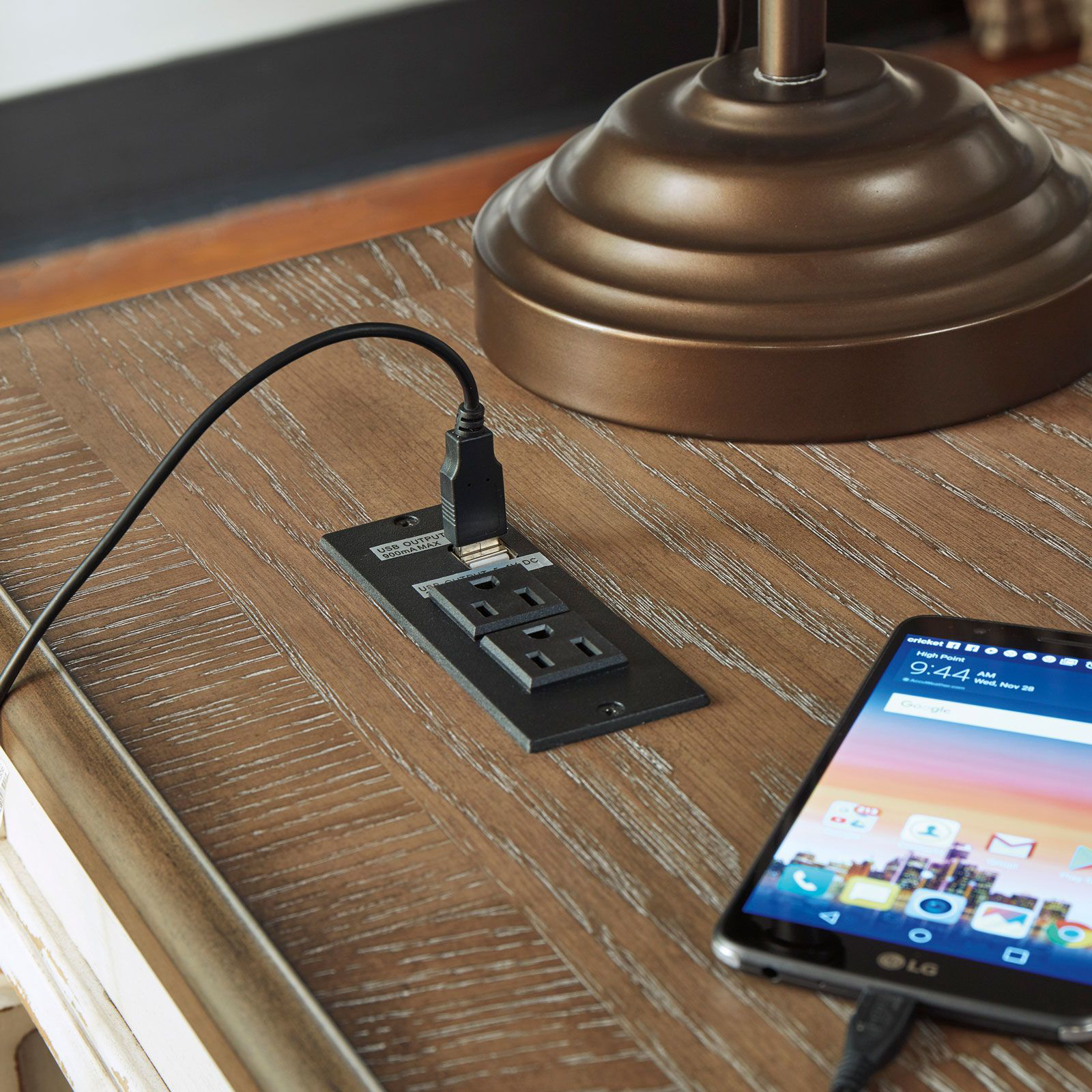 • Power supply in top with two outlets and one USB port