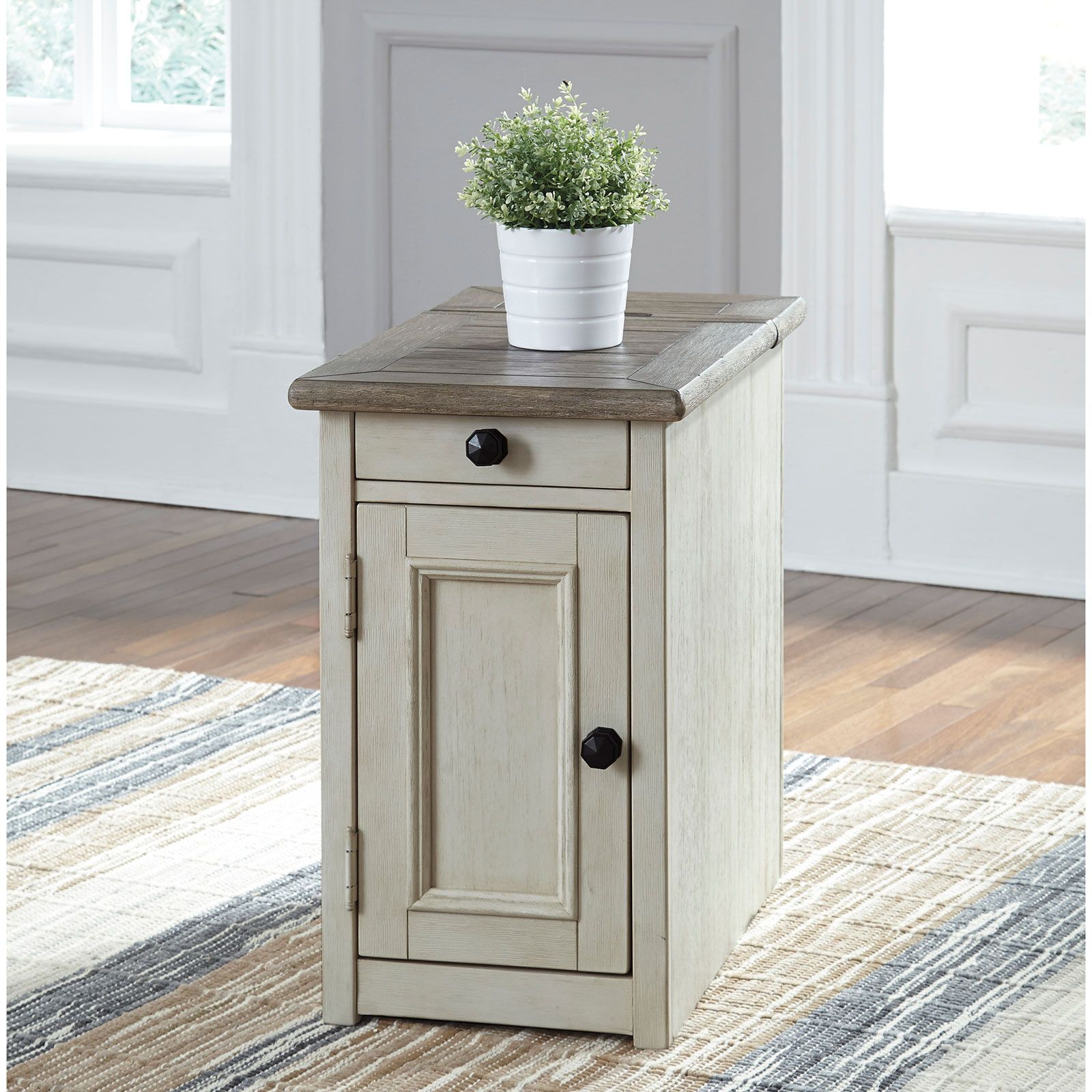 The Bolanburg collection was made with farmhouse style and functionality in mind. The two-tone finish features antique distressing with a white bottom and a natural finish top. You can keep your favorite items stored close by in the large, smooth-gliding drawer. Extra display space is provided on the bottom shelf.