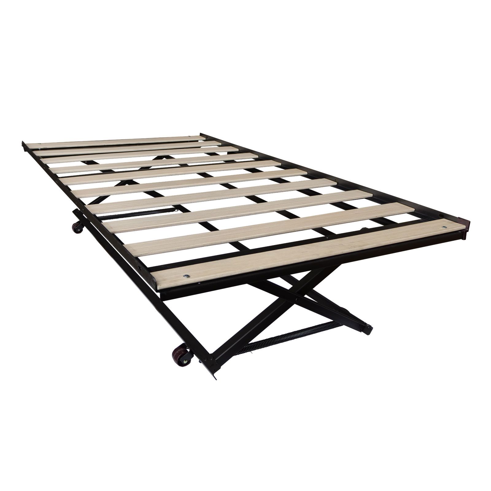 Slide this trundle unit under a bed to add an extra twin size sleeping area. Easy movement is provided with casters underneath and a spring loaded unit to easily raise. Wood slats create a sturdy foundation underneath the mattress.
