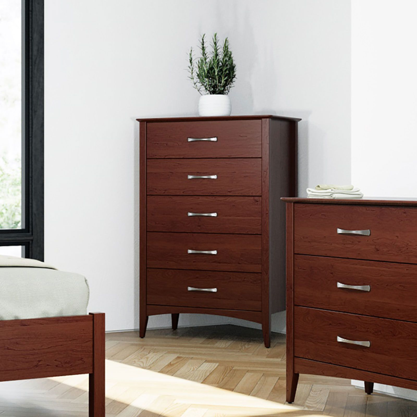 Complete your bedroom with American made furniture from Vermont. This Shaker style bedroom group is designed with simplistic elegance in mind. The hand wiped and sanded Birch and Chestnut finish is perfectly accented with modern, brushed nickel hardware. Easy glide and self-closing drawers are small features that promise excellent quality. Turn your room into a relaxing getaway with well-constructed and timeless design.