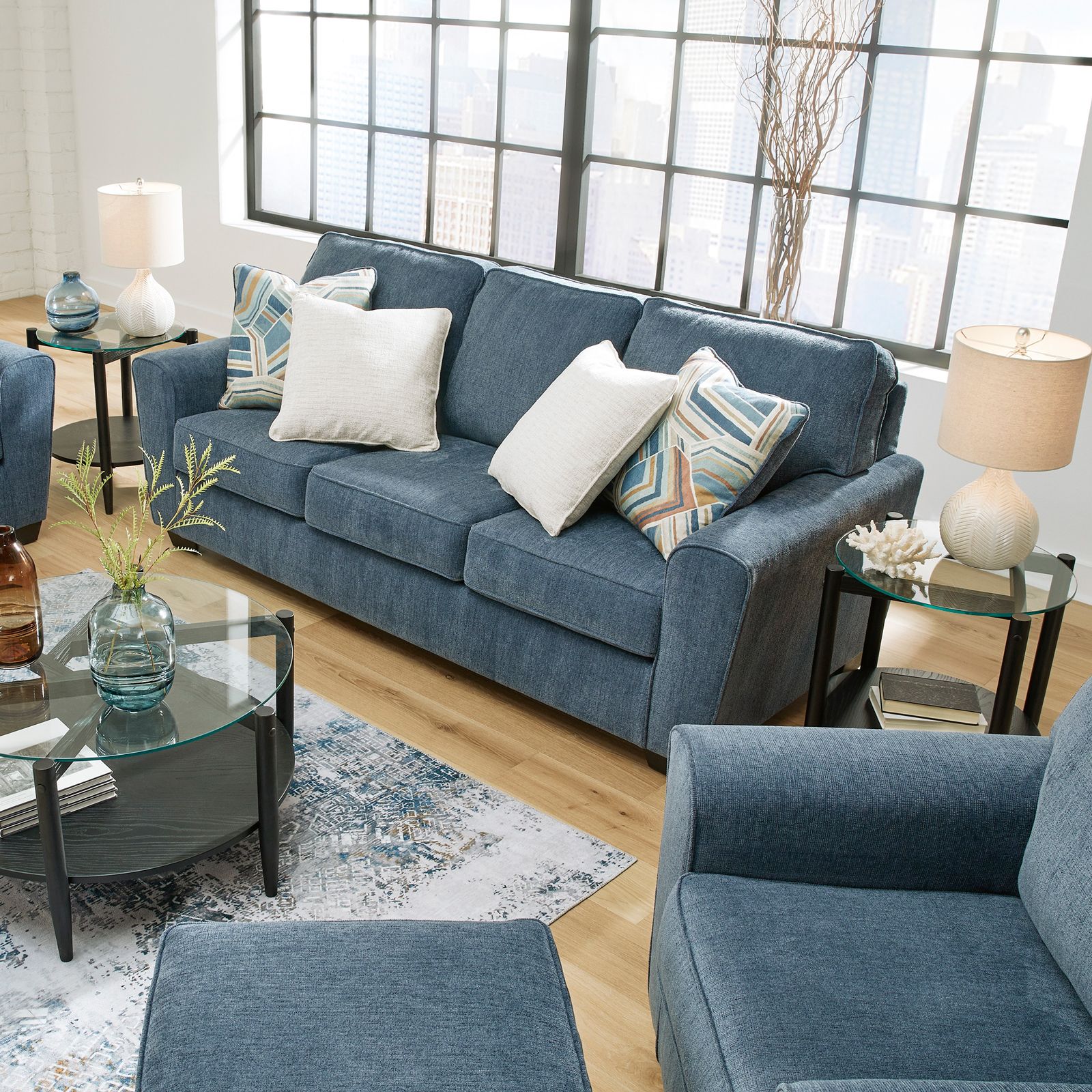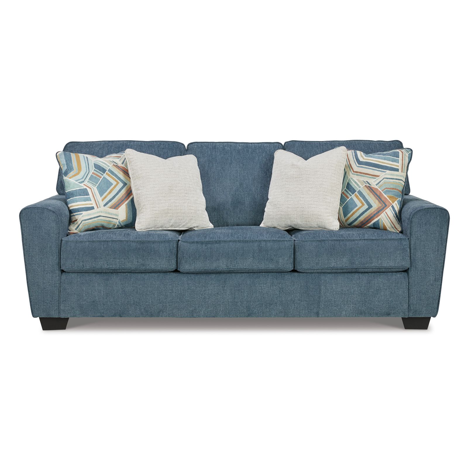The Cashton Blue Sofa is a must-have addition to your living room! This stationary sofa boasts a simple yet stylish design, perfect for a style refresh. Crafted in a blue color fabric, it exudes elegance and charm. With four 22" toss pillows included, you can easily add a touch of sophistication and plushness to your space. The exposed feet with a faux wood finish complete the look. Whether your style is classic or contemporary, the Cashton Blue Sofa with its crosshatched upholstery and delightful visual texture is sure to enhance any living room.