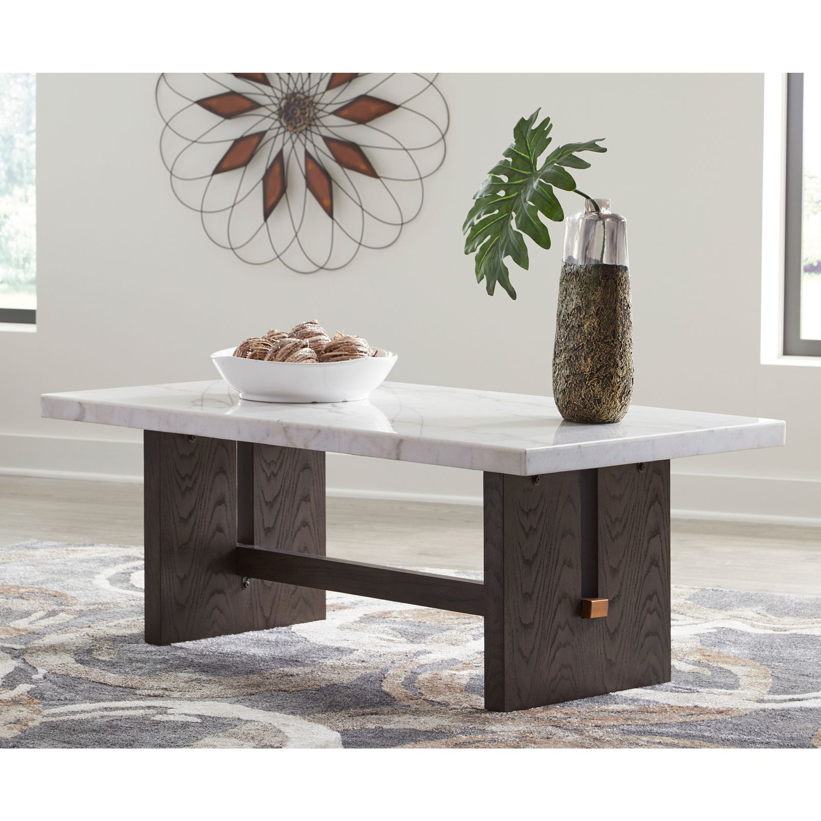 The Austanny Cocktail Table features a modern, artistic silhouette with an oval shape and warm brown wood-tone finish that highlights the stunning wood grain. It boasts a thick, substantial top and a curved plinth base, making it a naturally beautiful and functional centerpiece for any living room.