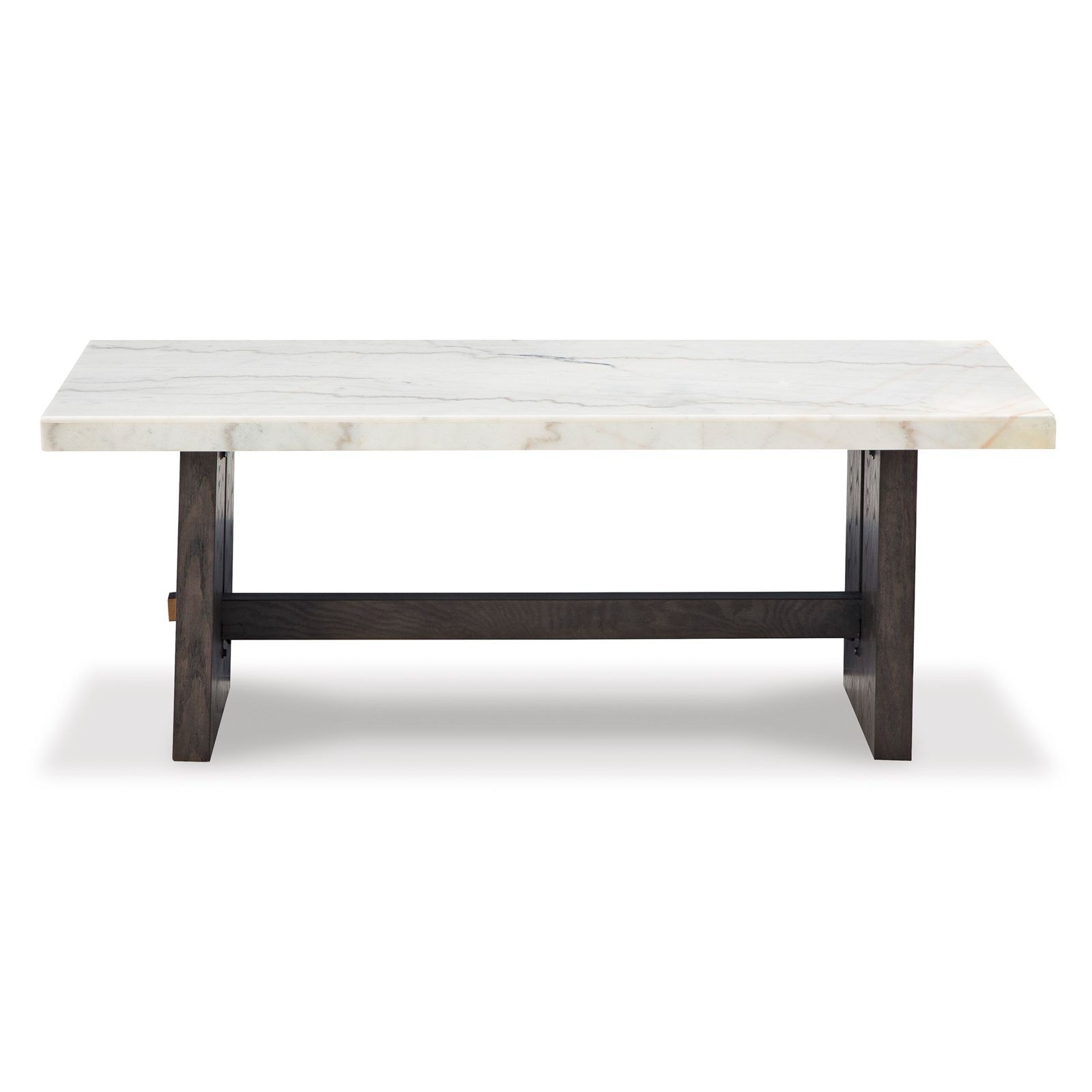 Welcome the Burkhaus Sofa Table into your home, where design meets practicality. Crafted from hard wood solids and veneers, it is graced with a dark waxy brown oak finish that beautifully complements its ultra-sleek lines. The thick, rectangular marble top is an epitome of natural beauty with inherent color variations, fissures, mineral deposits, and veining. It stands on a plinth base with a cutout and brass-top capped stretcher. This modern, clean-lined sofa table is not just a furniture piece but a timeless addition to your living room or family space.