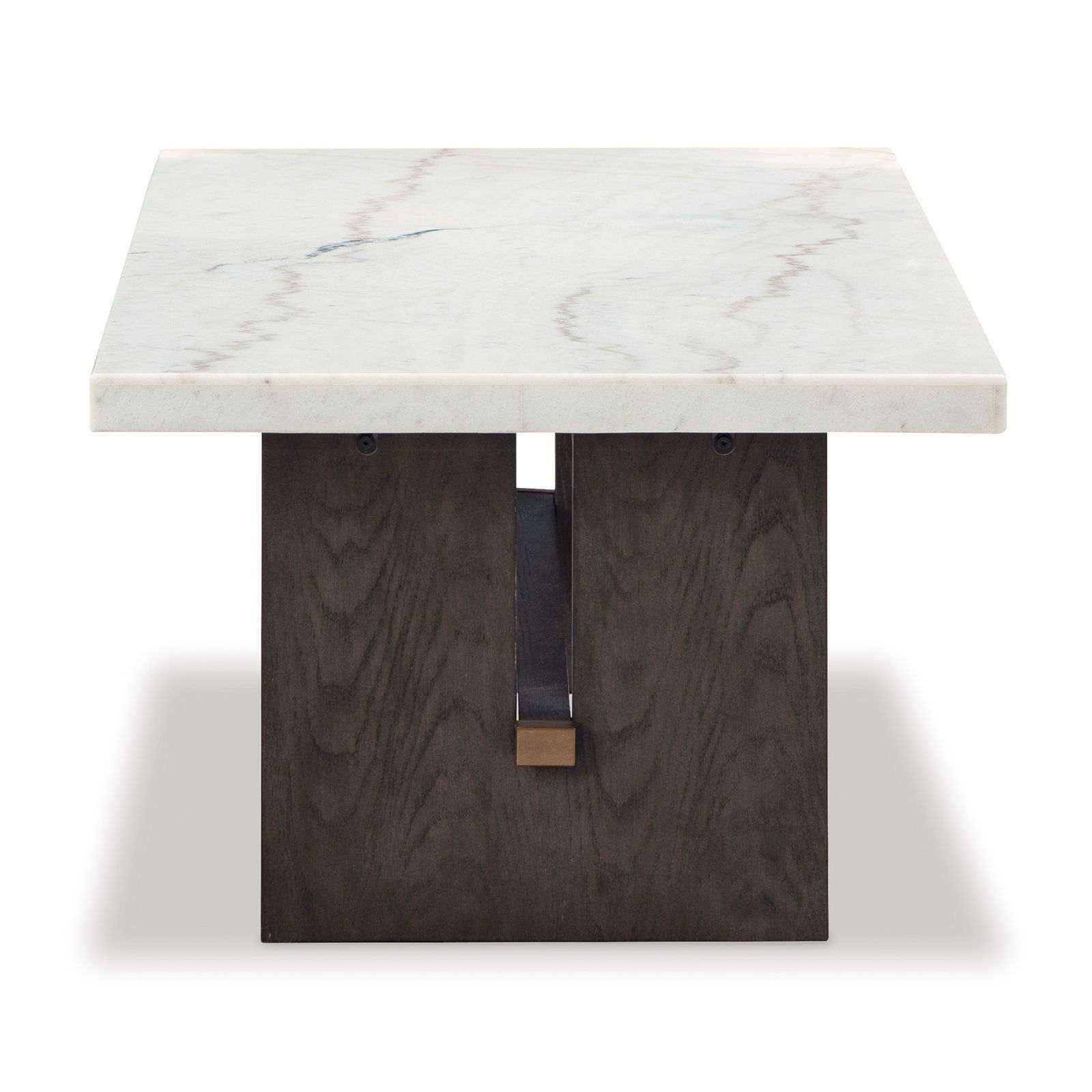 Introducing the Burkhaus End Table, a masterpiece of understated elegance. Constructed from hard wood solids and veneers and finished in a dark waxy brown oak, this end table offers a blend of charm and sophistication. The thick marble top, with its natural variations, fissures, mineral deposits and veining, adds a level of depth. The plinth base with its cutout and brass-top capped stretcher is a testament to a meticulous attention to detail. Modern, sleek lines and a timelessly stylish aesthetic make this end table the perfect addition to your living room or family space. With the Burkhaus End Table, you're not just investing in a piece of furniture, but a lasting statement of style.