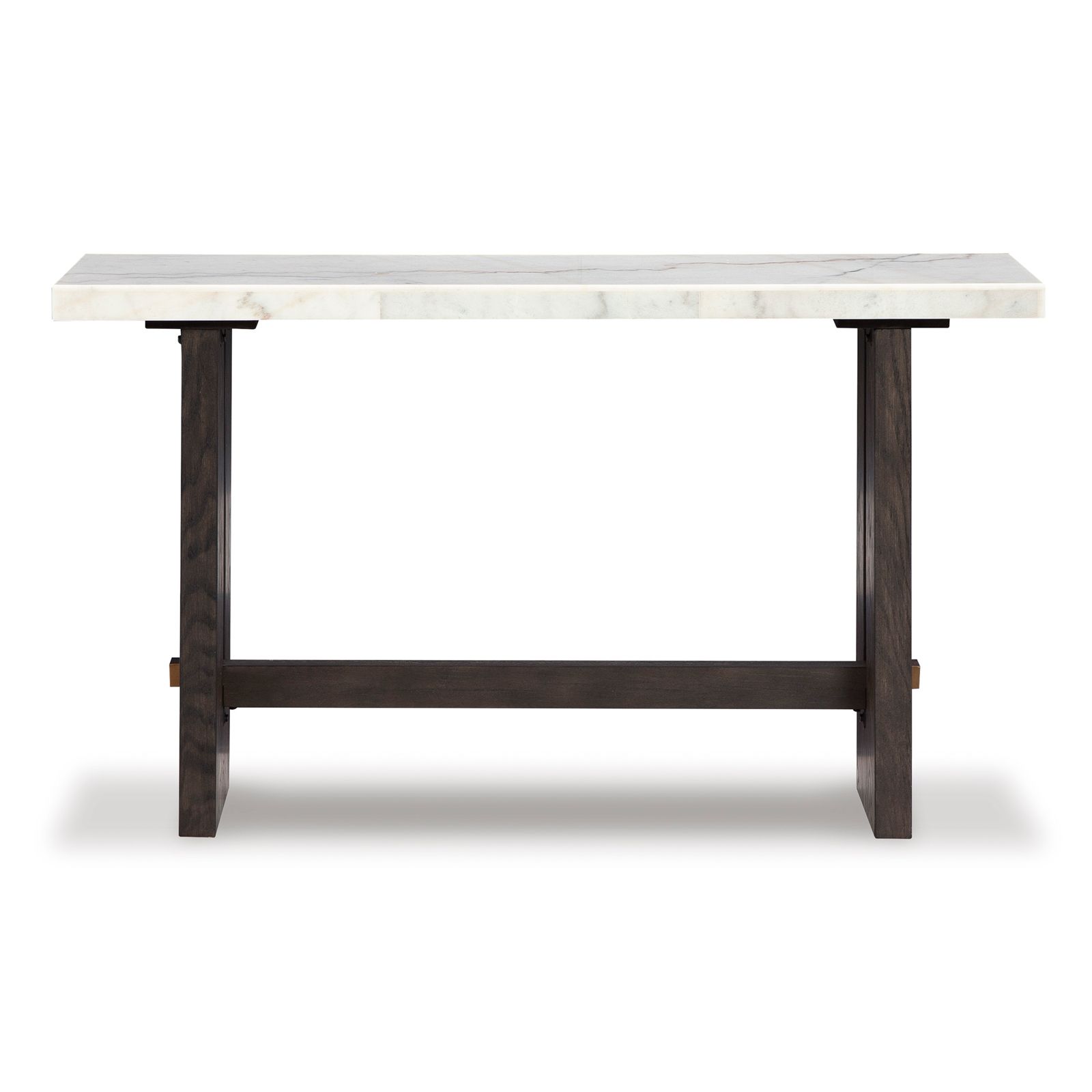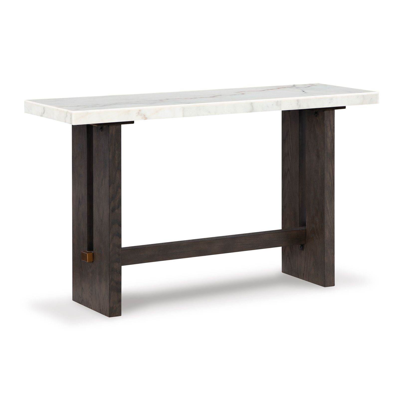 Introducing the Burkhaus Cocktail Table - the embodiment of sophisticated design. It boasts a rich, dark waxy brown oak finish that exudes an understated elegance. The thick, rectangular marble top is the epitome of grandeur, featuring naturally formed color variations, fissures, mineral deposits, and veining. Resting on a plinth base with an intriguing cutout and brass-top capped stretcher, this coffee table becomes more than just a piece of furniture - it becomes a conversation starter.