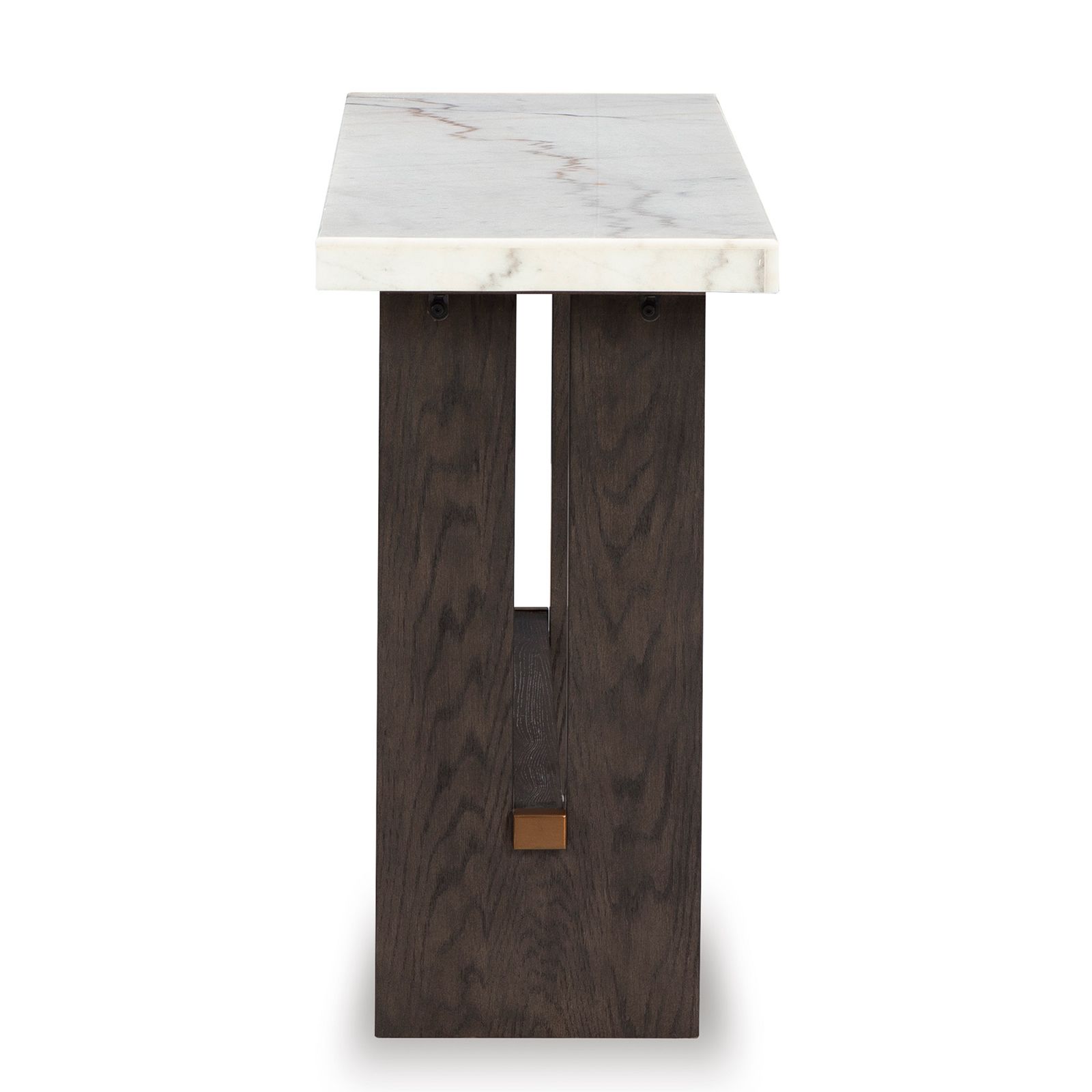 Introducing the Burkhaus End Table, a masterpiece of understated elegance. Constructed from hard wood solids and veneers and finished in a dark waxy brown oak, this end table offers a blend of charm and sophistication. The thick marble top, with its natural variations, fissures, mineral deposits and veining, adds a level of depth. The plinth base with its cutout and brass-top capped stretcher is a testament to a meticulous attention to detail. Modern, sleek lines and a timelessly stylish aesthetic make this end table the perfect addition to your living room or family space. With the Burkhaus End Table, you're not just investing in a piece of furniture, but a lasting statement of style.
