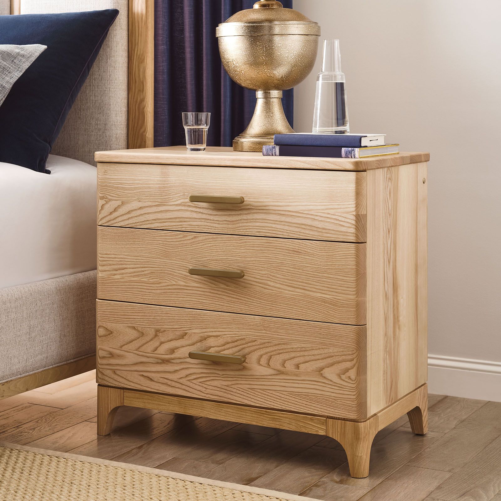 The Essence Nightstand pairs timeless design with everyday function, crafted from 100% solid Ash wood in a light, natural finish that showcases its strength and beauty. It features one dovetail drawer with whisper-quiet glides, polished brass hardware, and a fixed slatted wood shelf for added storage. Built with mortise and tenon joints and adjustable levelers, it’s a sturdy, elegant addition to the Essence Collection.