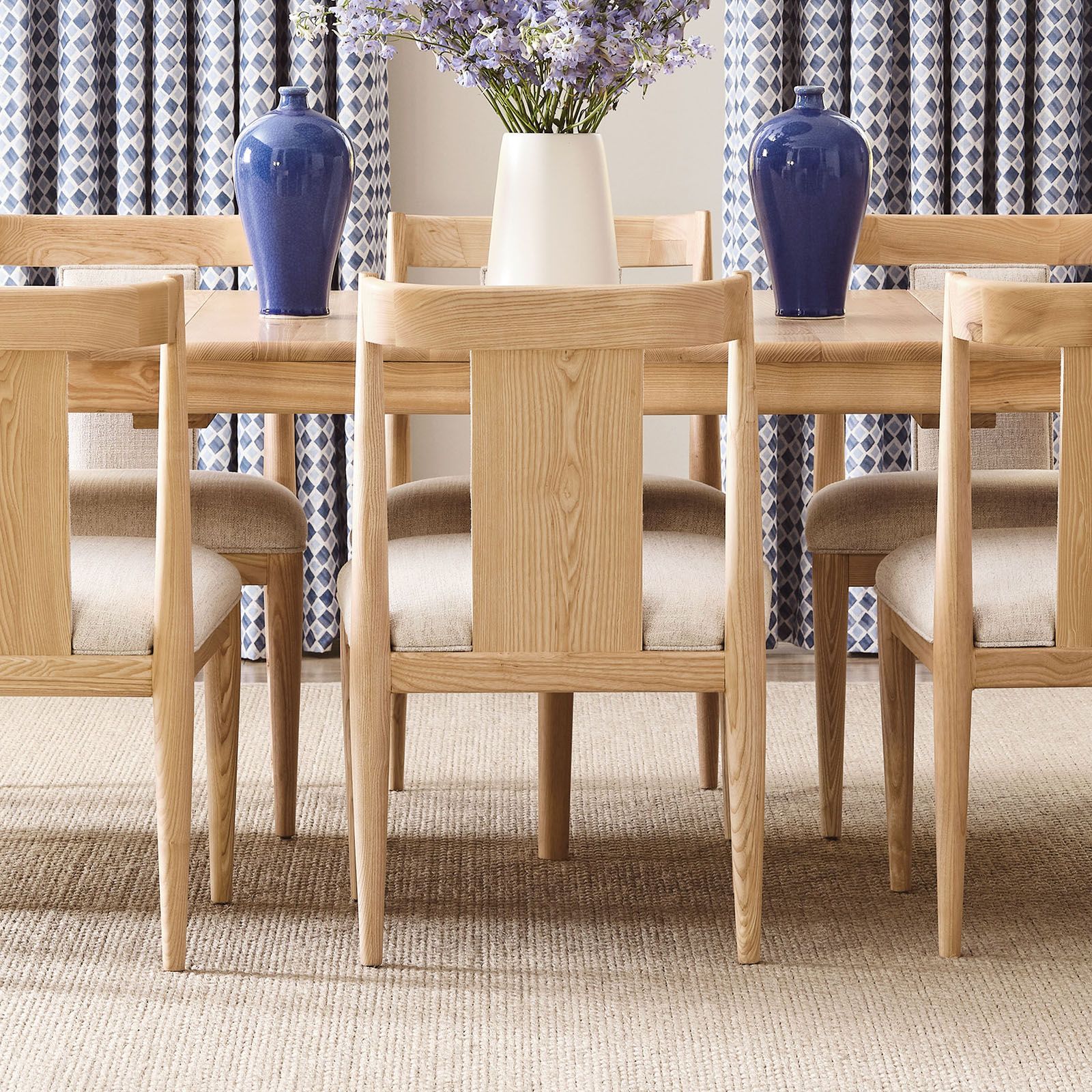 The Hanover Dining Table from the Essence Collection showcases the natural beauty of 100% solid Ash wood with a light, minimal finish. Thoughtfully crafted with clean lines and subtle shaping, it extends from 72" to 112" with two 20" leaves and includes a removable center support leg. Adjustable levelers and a Kinguard Performance Finish add everyday durability to this timeless piece.