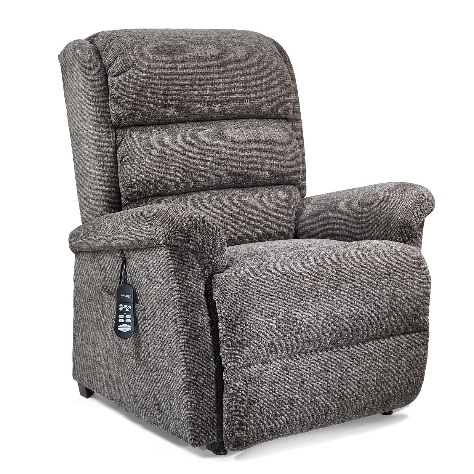 Experience personalized relaxation with the Polaris Noah Midnight Medium Lift Chair by UltraComfort. Designed for ergonomic support, it features a tailored pillow back, plush arms, and an extra-wide chaise pad for hours of comfort. The two-zone Comfort Zone system with patented Stellar positioning lets you independently adjust the back and footrest for ultimate ease. Enjoy convenient controls with the programmable AutoDrive remote and the added security of a battery backup. Upholstered in soft gray polyester, this chair offers style, comfort, and function with a weight capacity of 400 lbs. Plus, enjoy free premium in-home delivery and setup with qualifying lift chair purchases!