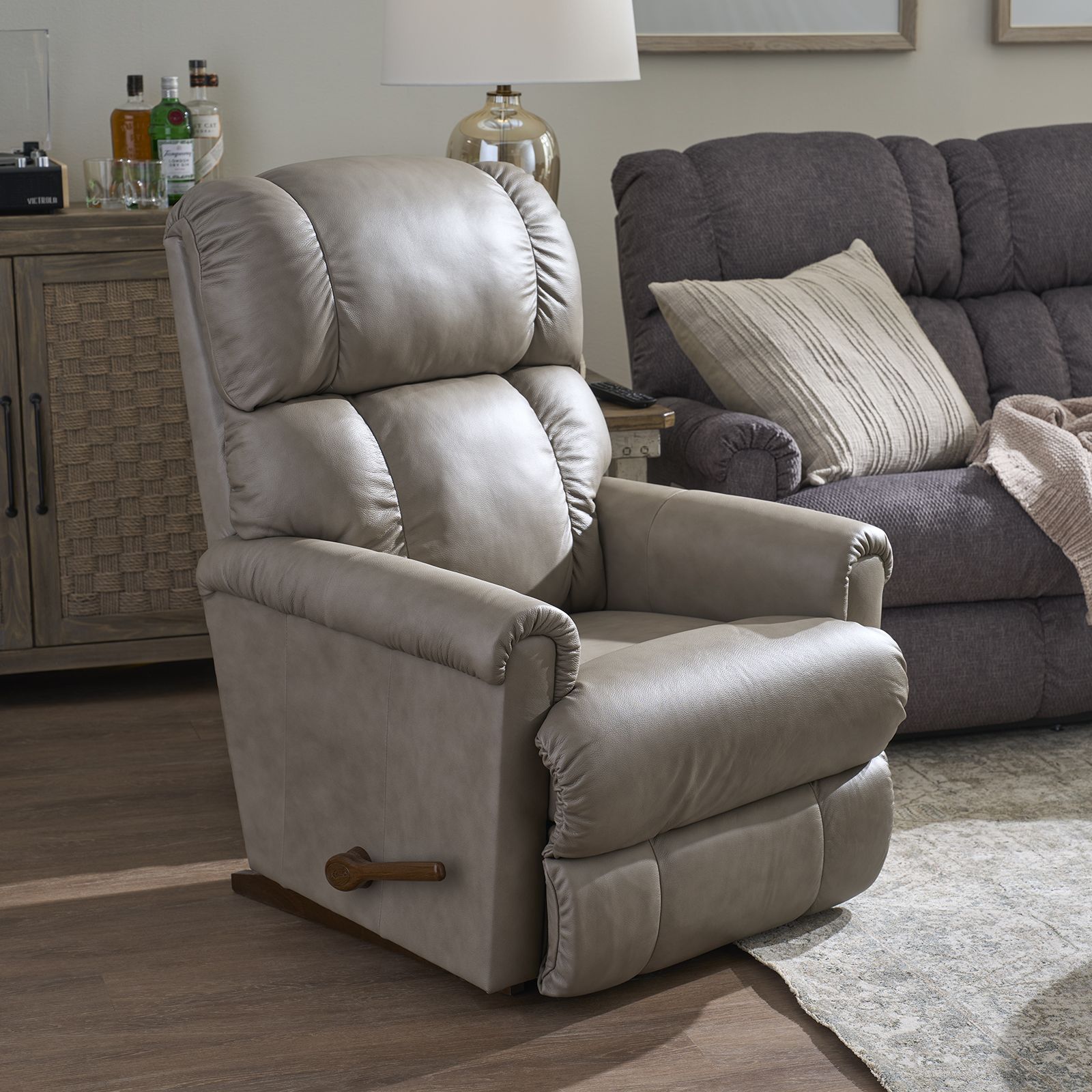 Sink into luxurious comfort with the Pinnacle Fog Rocker Recliner, crafted for relaxation and long-lasting support. Upholstered in a soft, light fog-colored 100% polyester fabric, this ultra-comfortable recliner features a gentle rocking motion and 16 soothing reclining positions. Designed with a tall, channel-stitched back, chaise seat, and padded rolled arms, it offers full-body support and plush cushioning with double-picked blown fiber fill and high-grade foam that maintains its shape. The convenient side-mounted handle lifts the legrest into three safely locked positions, while the back reclines independently for customized comfort. Built with premium-grade materials and assembled by skilled artisans, this La-Z-Boy favorite blends timeless comfort with trusted quality.
