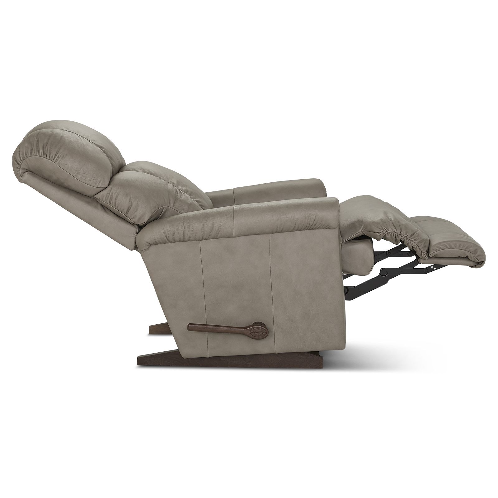 Relax in style with the Pinnacle Brown Leather Rocker Recliner. Covered in supple leather where it matters and durable vinyl on the sides, this manual recliner features padded rolled arms, a chaise seat, and a tall, channel-stitched back for lasting support. Rock gently or recline into 16 positions using the easy side handle. With high-grade foam cushions, premium materials, and expert craftsmanship from La-Z-Boy, comfort and quality are built to last.