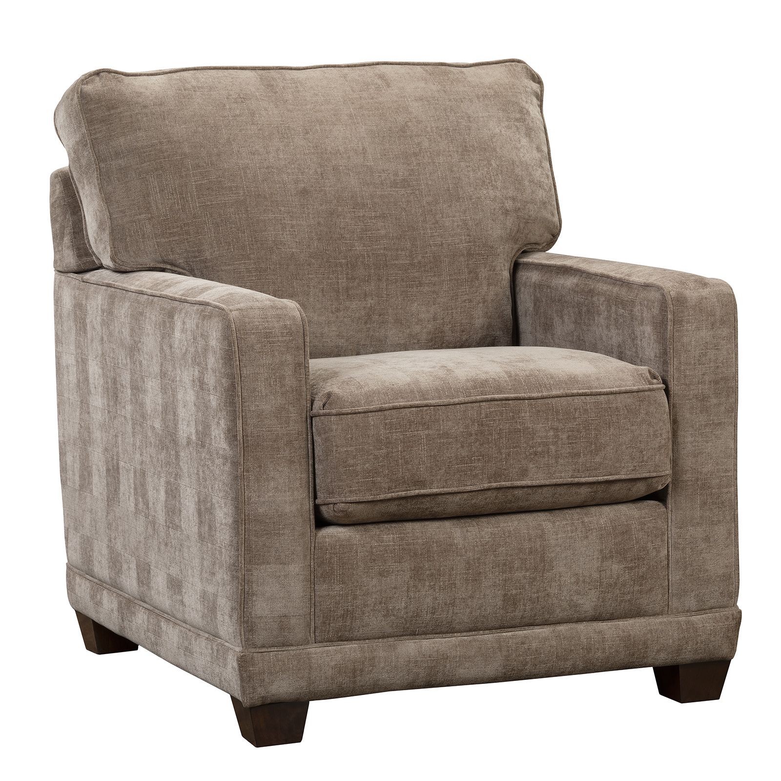 The Kennedy Mocha Chair brings a sleek, casual elegance to any living space. Its railroaded brown color enhances versatility. Featuring patented a ComfortCore cushion, this stationary chair delivers exceptional comfort. Narrow track arms and decorative wood legs create a clean, modern profile, while welt trim adds a refined touch.