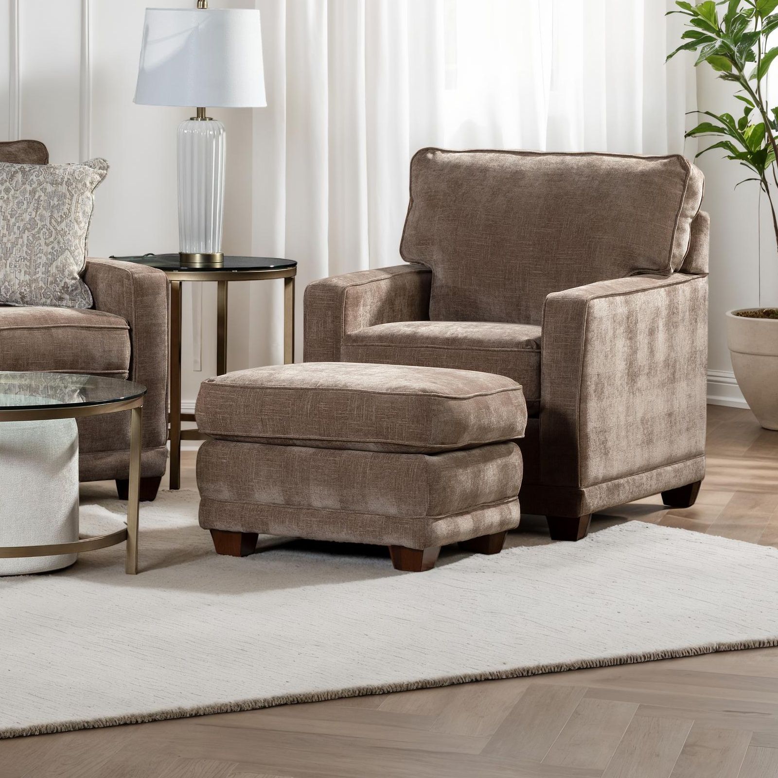 The Midtown Mushroom Swivel Glider brings effortless style and smooth motion to any space. Upholstered in a soft polyester, rayon, and linen blend in a light cream hue, its streamlined design is perfect for smaller rooms. A 360-degree swivel base and gentle gliding motion offer soothing comfort, while the tight back, subtly curved track arms, and welt trim add a refined touch. With a premier foam seat cushion and double-picked fiber fill for lasting shape and support, this chair is as durable as it is inviting—crafted in the U.S.A. and backed by a limited lifetime warranty.
