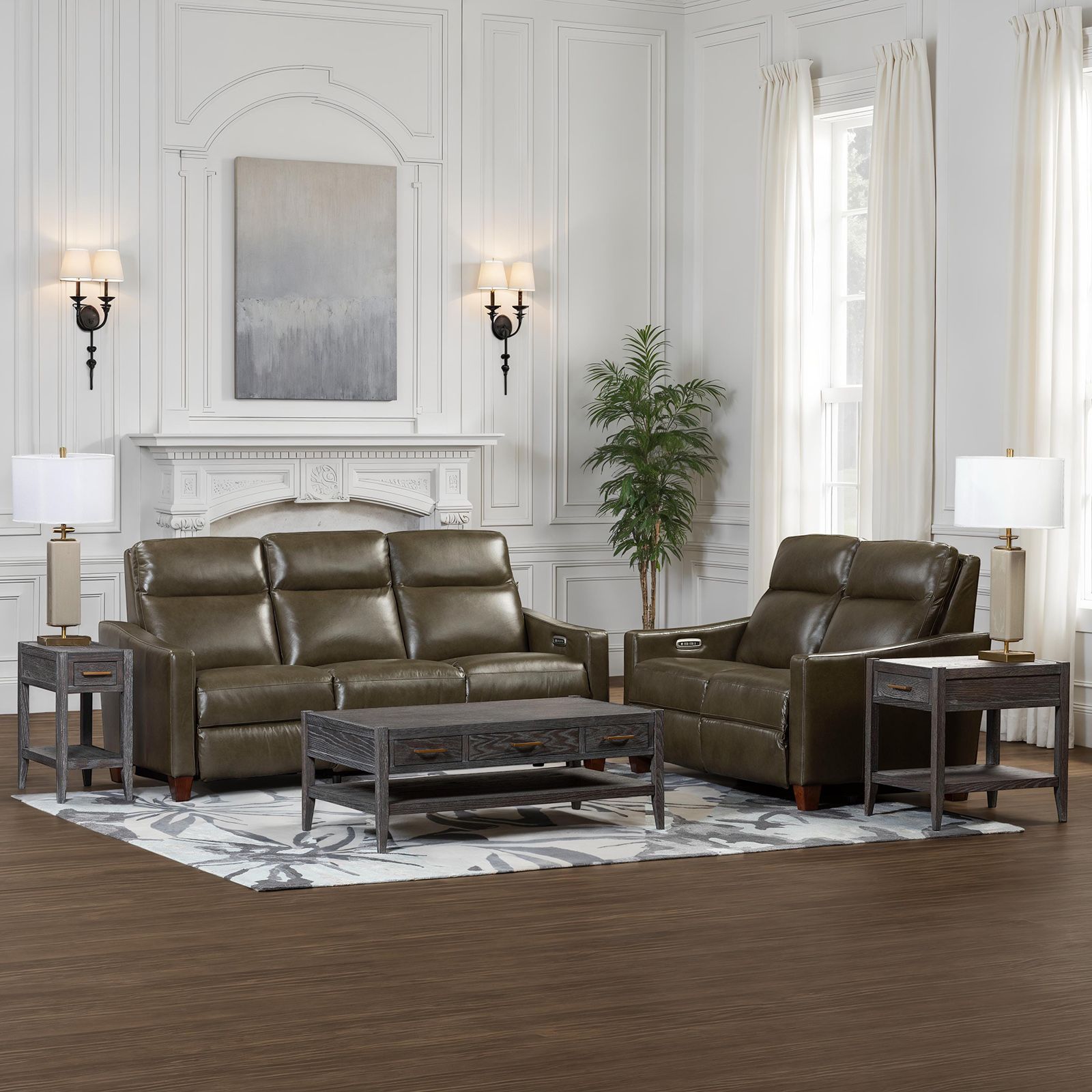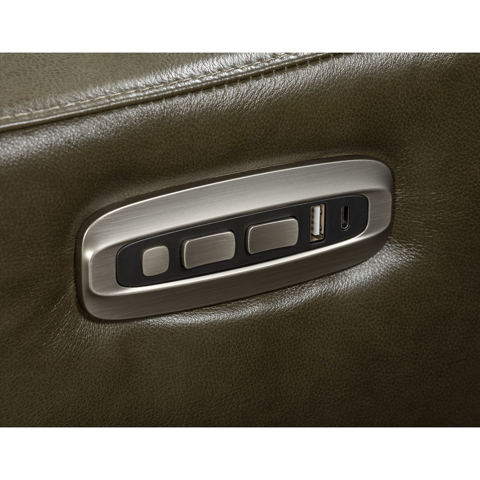 The Quinault Olive Power Recliner Loveseat combines crisp, classic design with cutting-edge comfort. Upholstered in real leather everywhere you touch, with matched vinyl on the sides and back, its rich olive green hue is both bold and refined. Tall foam box-border back cushions and tailored faux box-border seats deliver luxurious, supportive comfort, while gently sloping track arms and decorative wood legs conceal advanced reclining features. Enjoy zero gravity recline, power-tilt headrests, and dual-seat adjustability—all at the touch of a button. Built-in USB ports and high-performance materials ensure lasting style and function.