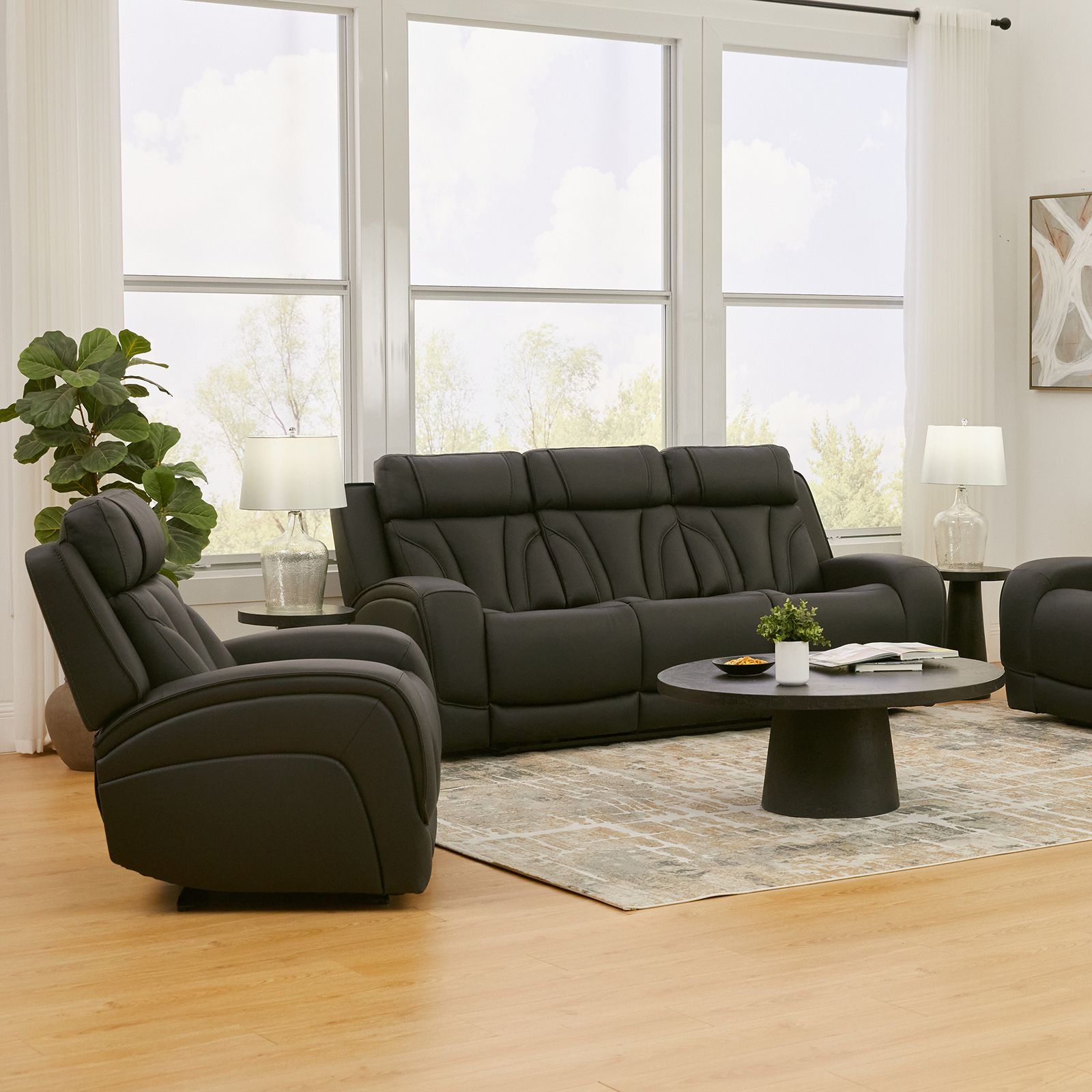 The Blanca Jet Black Leather Power Recliner delivers bold style, immersive sound, and exceptional comfort in one statement piece. Upholstered in rich black top-grain leather on the seating areas with matched faux leather elsewhere, this over scaled recliner features plush, multi-layered backs and armrests for superior support. One-touch power reclining, an adjustable headrest, and zero-gravity positioning, while built-in speakers, a subwoofer, and a vibration-enhancing transducer sync with the audio for a fully immersive relaxation experience.