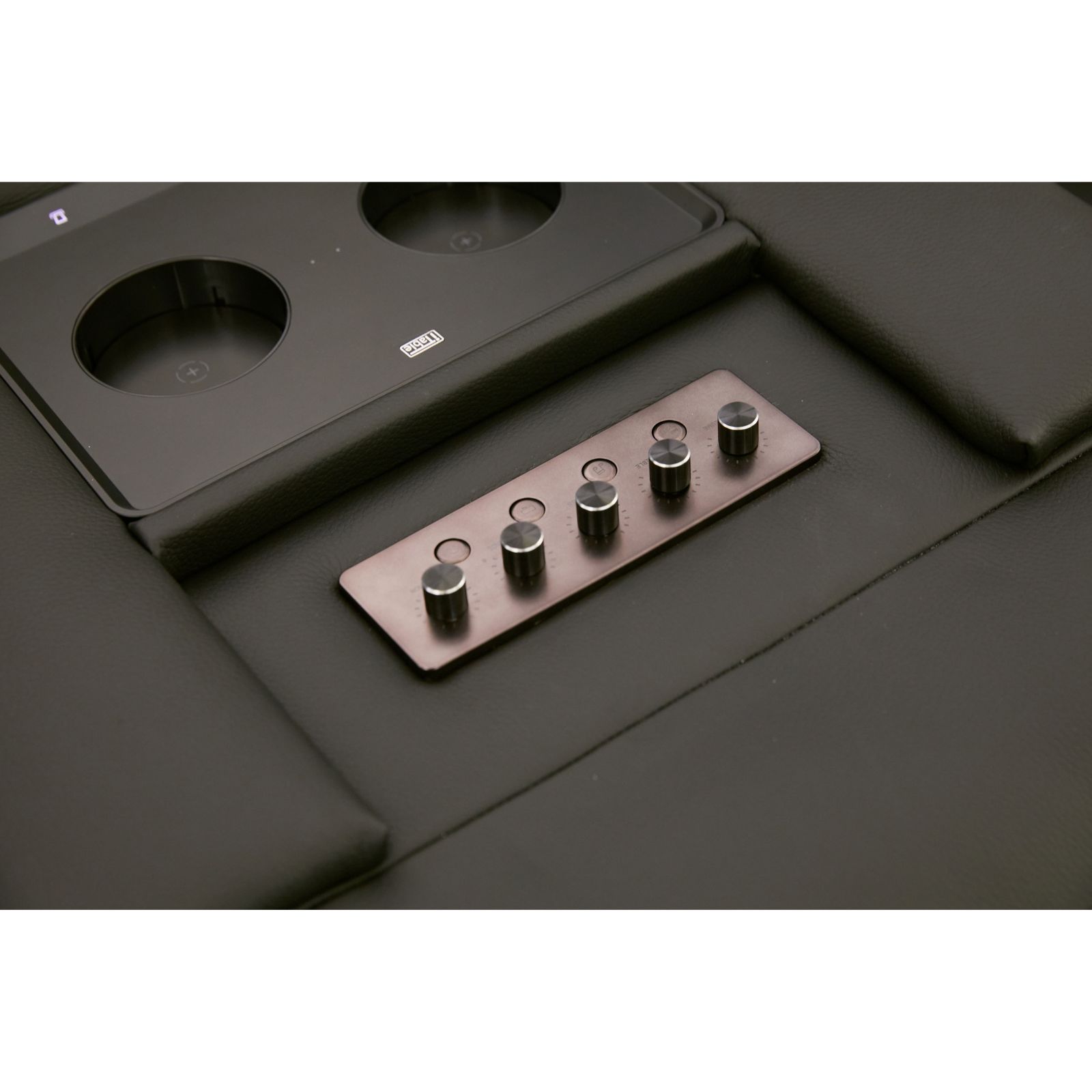 The Blanca Jet Black Leather Power Recliner Console Loveseat pairs bold style with next-level comfort and entertainment. Upholstered in black top-grain leather on the seating areas with matched faux leather elsewhere, it features plush, over scaled cushioning, one-touch power reclining, adjustable headrests, and zero-gravity positioning. The center console adds a built-in cooler, wireless charging, USB ports, cup holders. Immersive sound features integrated speakers, subwoofer, and vibration-enhancing transducer.