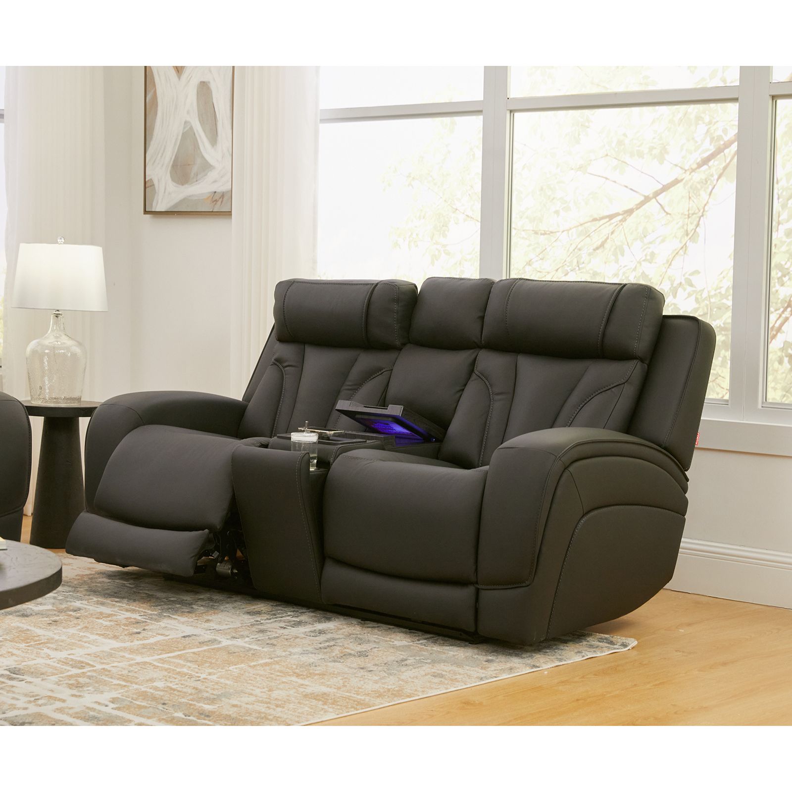 The Jetset Charcoal Leather Power Recliner Loveseat combines luxury, comfort, and modern features to enhance any living room. Wrapped in top-grain leather with matching vinyl on the sides and back, this charcoal gray loveseat offers a sleek, contemporary look. Decorative topstitching and breathing holes on the back and seat enhance both style and comfort. Its zero-gravity reclining feature helps reduce neck, back, and hip pain, while the power-adjustable headrests provide customizable support. Each arm features hidden storage and LED-lit cupholders, while the center console offers a wireless charging platform, hidden cupholders, and built-in USB/USB-C ports for ultimate convenience.