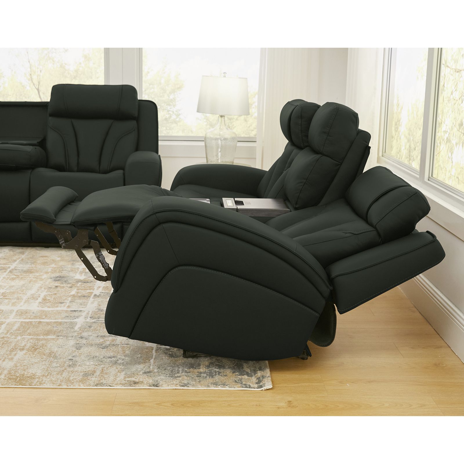 The Blanca Jet Black Leather Power Recliner Sofa combines bold style, immersive sound, and premium comfort in one statement piece. Upholstered in black top-grain leather on the seating areas with matched faux leather elsewhere, it features plush, over scaled cushioning and one-touch power reclining with zero-gravity positioning. A center drop-down table offers a cup holder, USB ports, wireless charging, and sound controls for the built-in SoundSphere 2.1 stereo, complete with speakers, subwoofer, and vibration-enhancing transducer for a truly immersive experience.