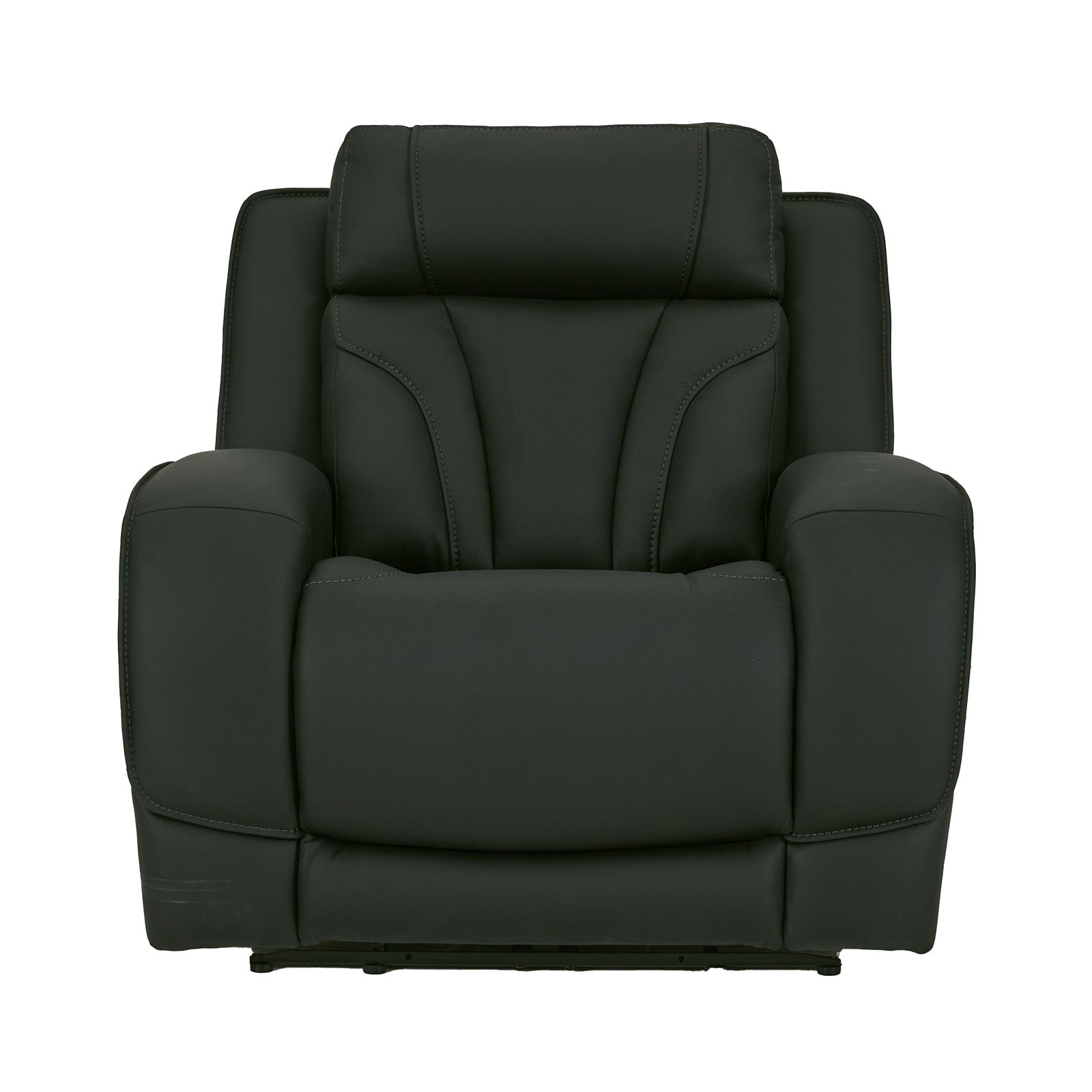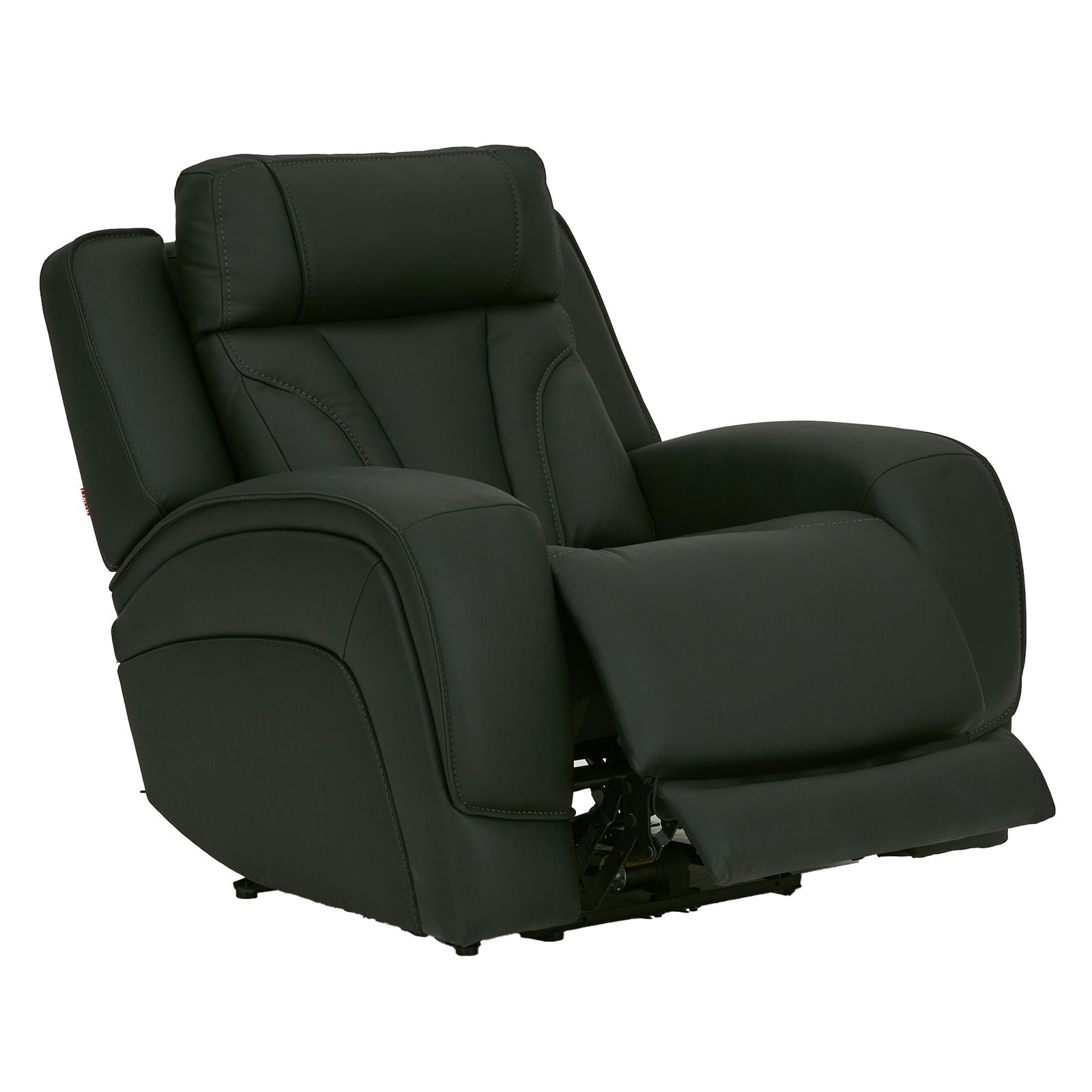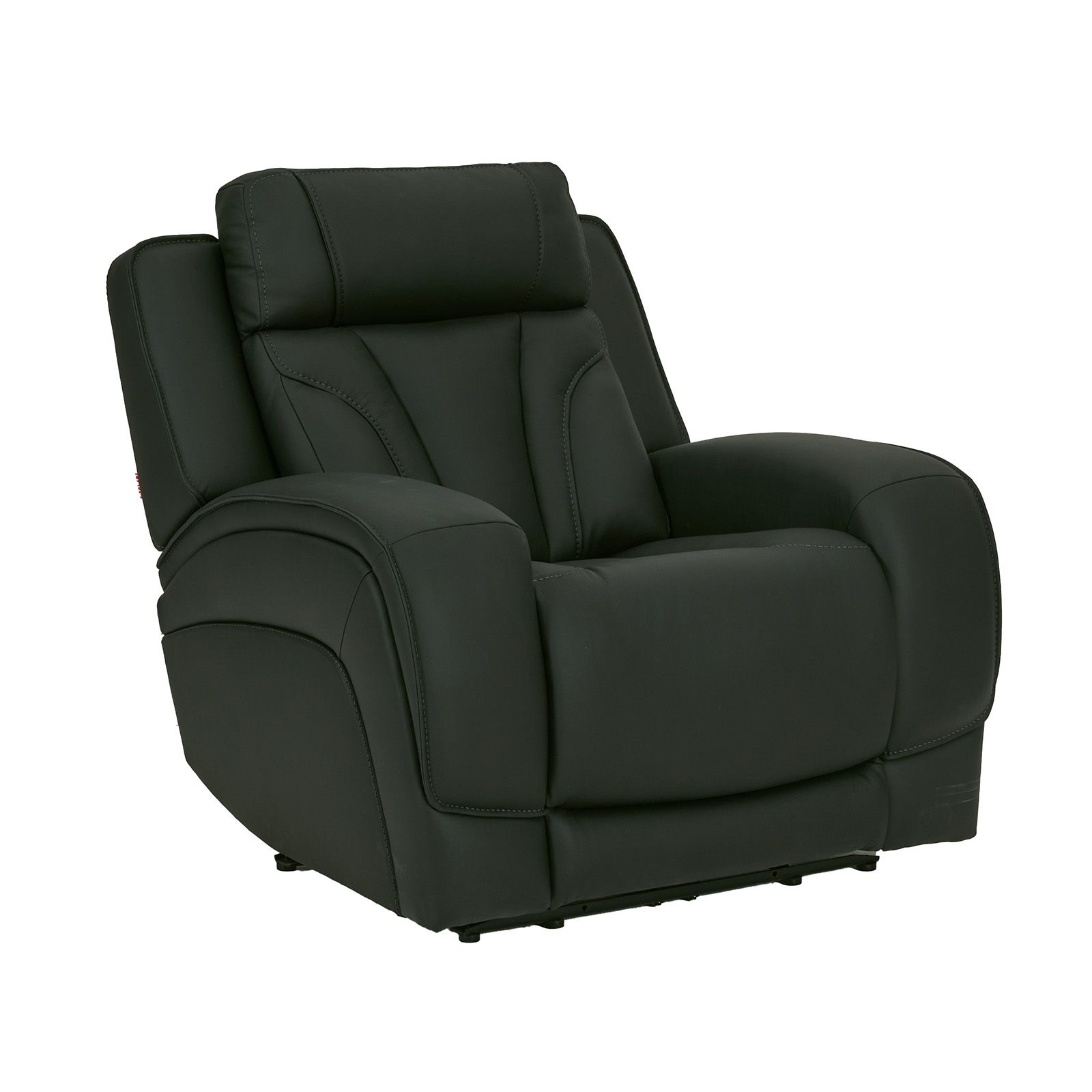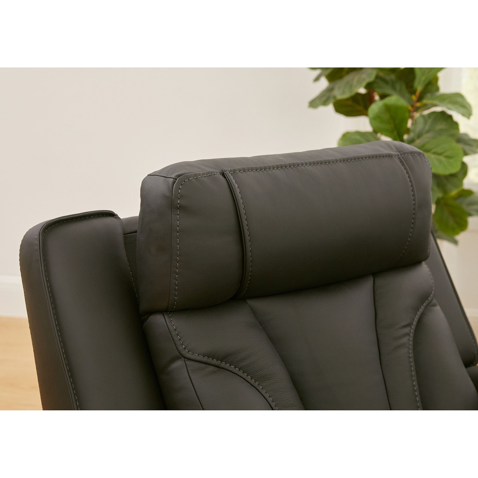The Jetset Charcoal Leather Power Recliner offers modern comfort and luxurious style, making it the perfect addition to any space. Upholstered in top-grain leather with matched vinyl on the sides and back, its sleek charcoal gray color and decorative topstitching elevate its contemporary design. The zero-gravity reclining feature reduces neck, back, and hip pain, while the breathing holes on the back and seat ensure added comfort. Each arm lifts to reveal hidden storage and LED-lit cupholders, and built-in USB and USB-C ports keep your devices charged. The power-adjustable headrest completes the ultimate lounging experience.
