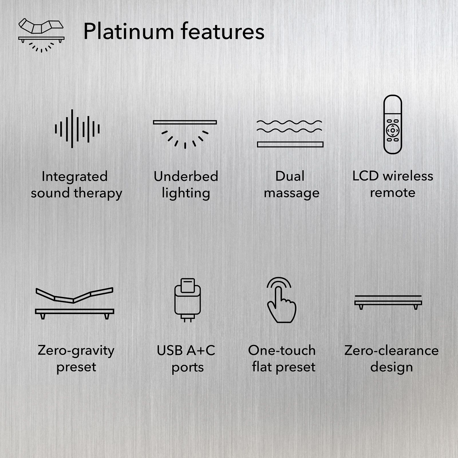 Reimagine your rest with the baselogicâ„¢ Platinum Adjustable Base, combining premium comfort with advanced customization. Enjoy head and foot adjustability, automatic pillow tilt, and a zero-gravity preset for ultimate relaxation. A wireless LCD remote gives you easy access to dual massage, anti-snore, and memory presets, while USB-A and USB-C ports keep devices charged. Ambient underbed lighting and integrated sound therapy create a calming atmosphere, and the foldable, zero-clearance design with 4-in-1 adjustable legs ensures flexibility for any bedroom setup.