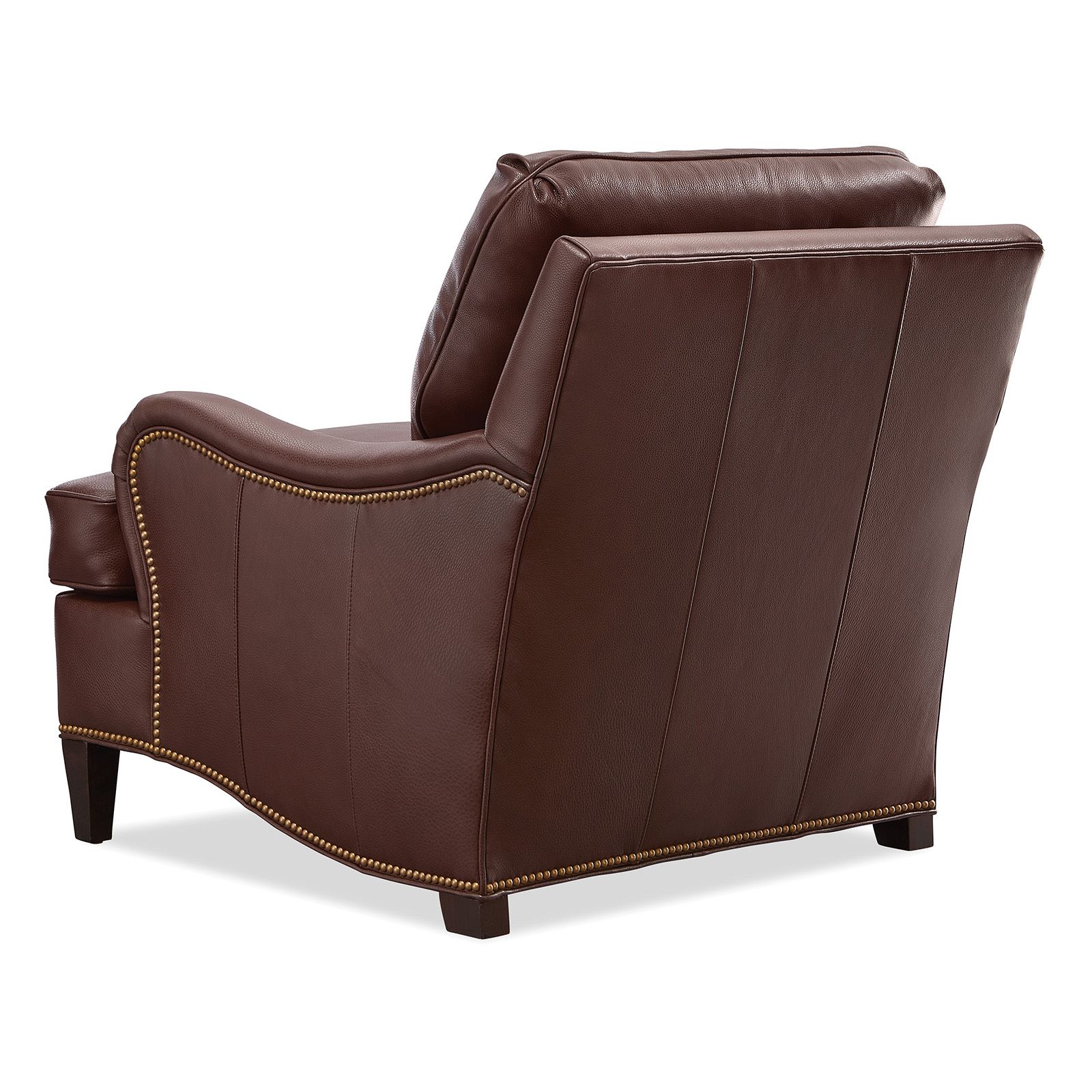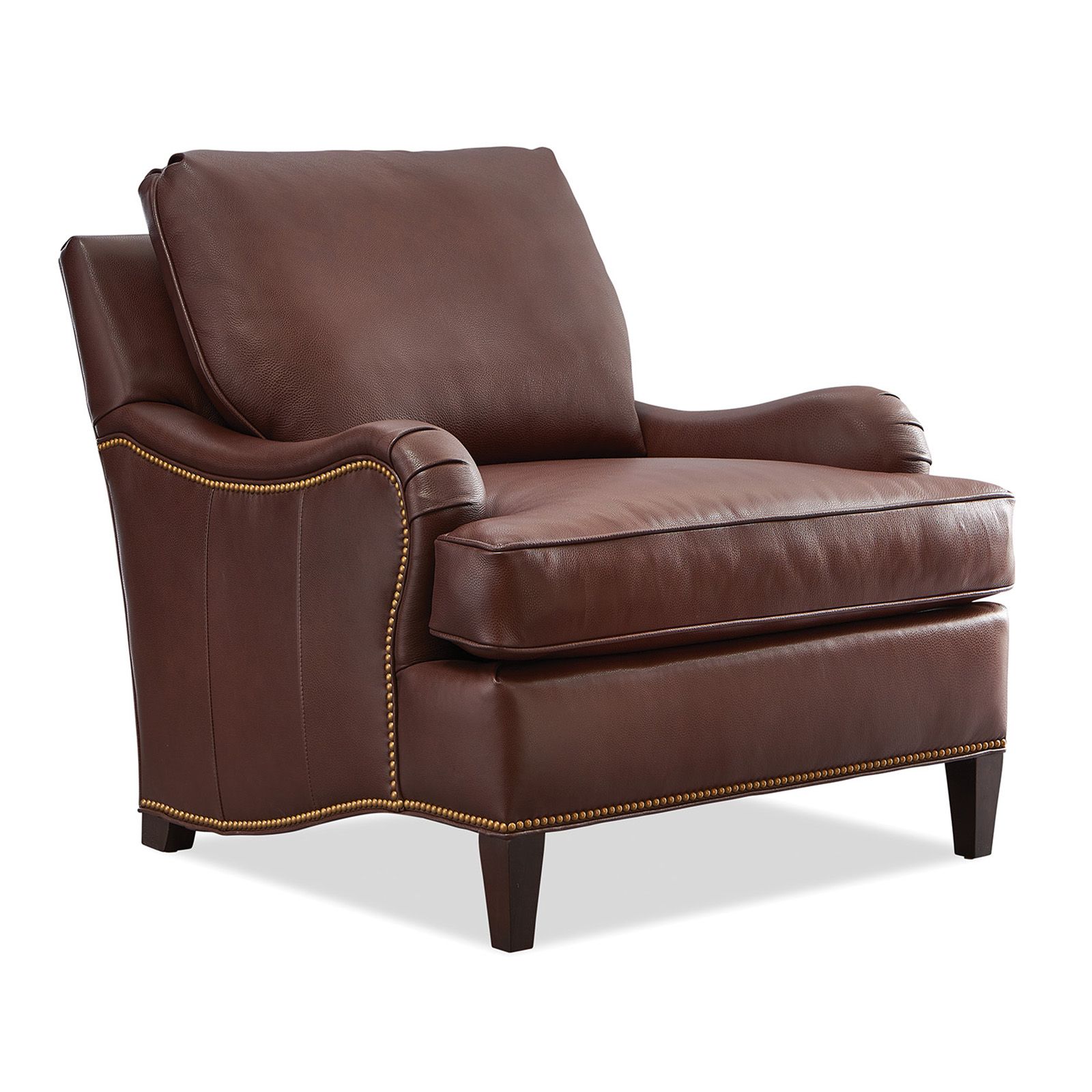 The Eli Cedar Chair is handcrafted in North Carolina with timeless style and lasting comfort. Upholstered in 100% top-grain Swedish leather in “Fenway Cedar” brown, it features a solid wood frame with reinforced corners, eight-way hand-tied coils, and a Qualux seat cushion for enduring support. Brushed nailhead trim, sock arms, and tapered mahogany-finished legs complete its classic design.