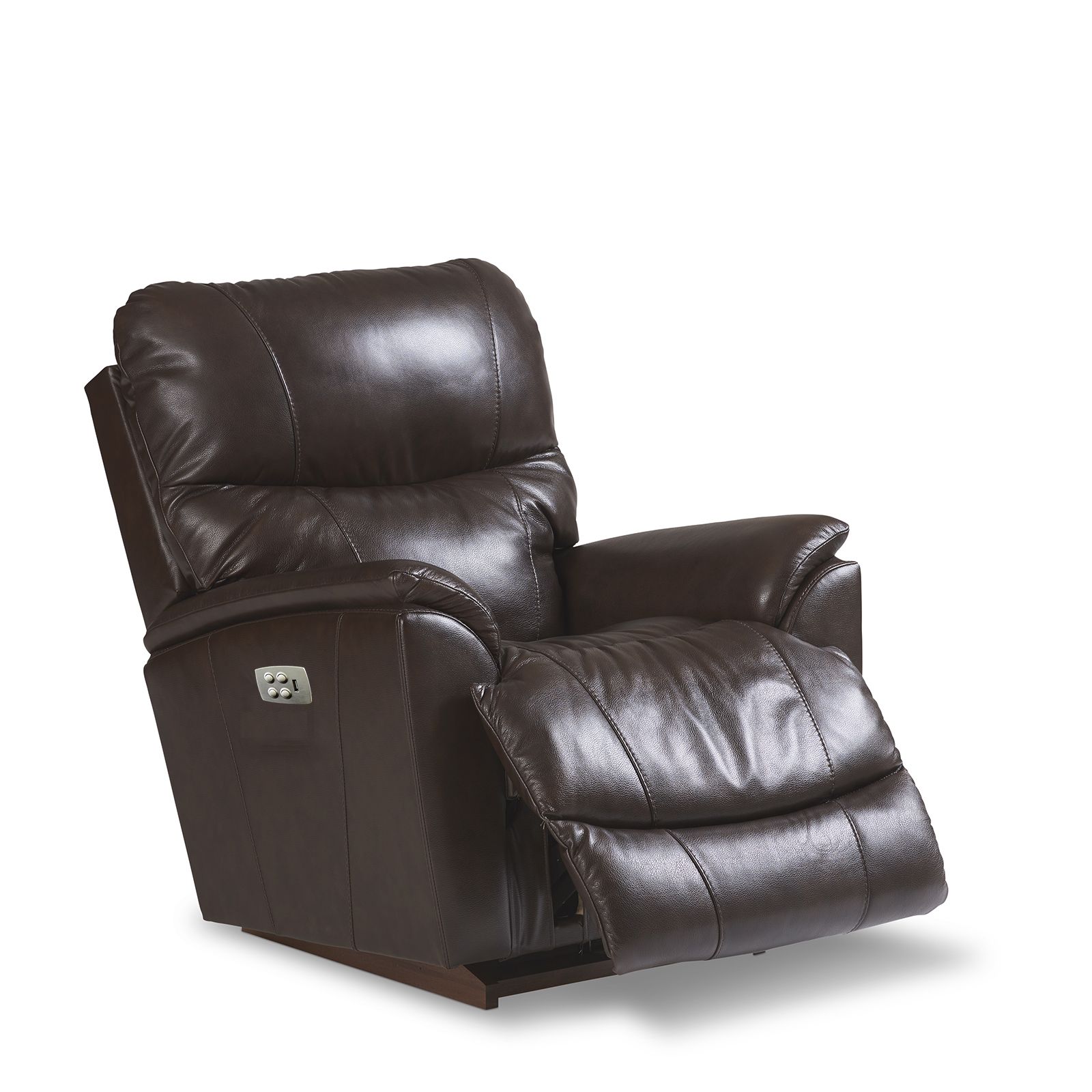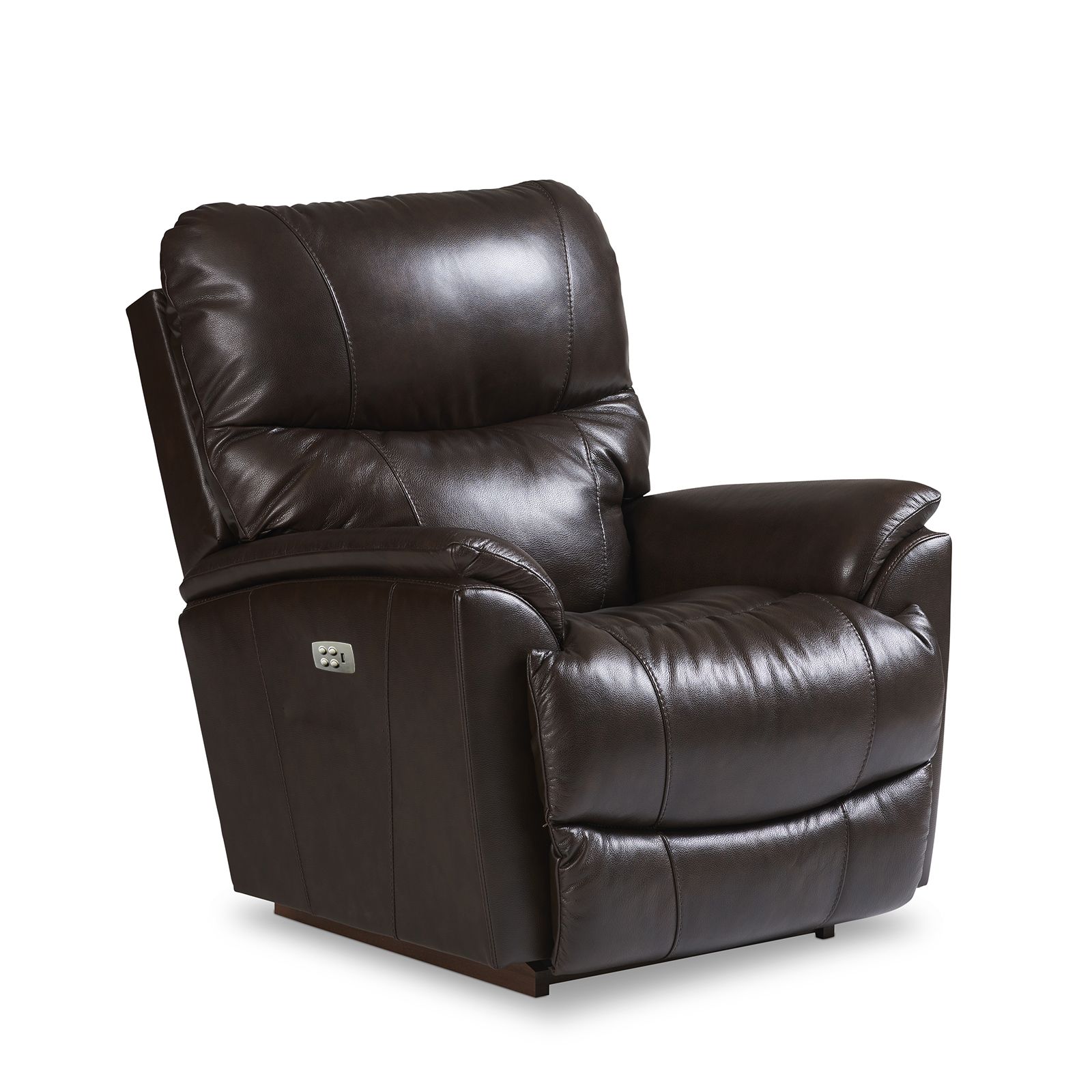 Discover stylish comfort with the Trouper Gray Leather Swivel Power Rocker Recliner. In dark gray, it features leather touch points and matched vinyl sides/back. Enjoy fluid lines, a cozy blown-fiber split back, and a sculpted bucket chaise seat. With a 360-degree swivel, smooth rocking, power-adjustable headrest and lumbar, and independent reclining via cordless remote, this recliner offers ultimate relaxation. Two memory options, a home button, and a built-in USB port add convenience. High-grade foam cushions and a limited lifetime warranty ensure lasting comfort and quality.