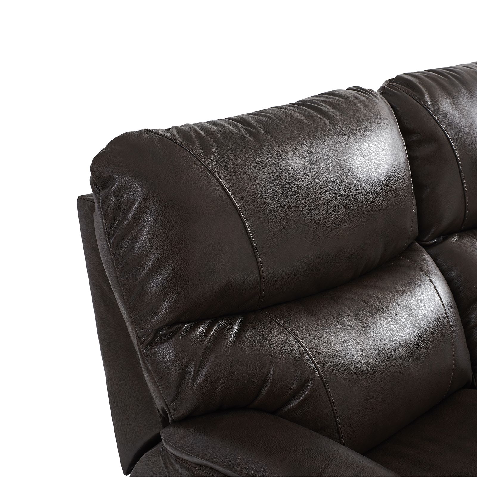 The Trouper Walnut Leather Recliner Sofa brings casual comfort home with a clean, laid-back style perfect for family nights. Upholstered in real walnut brown leather where you touch, it features three sculpted bucket seats and plush split back cushions for head-to-toe support. The manual reclining seats on each end let you kick back your way—with or without raising the footrest—using easy latch releases. With padded arms, durable stitching, and long-lasting materials, Trouper is built for everyday relaxation and made to last.