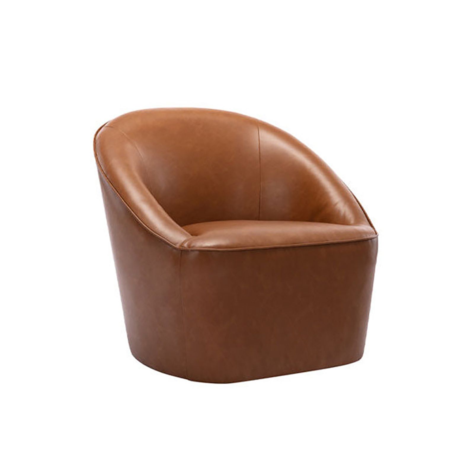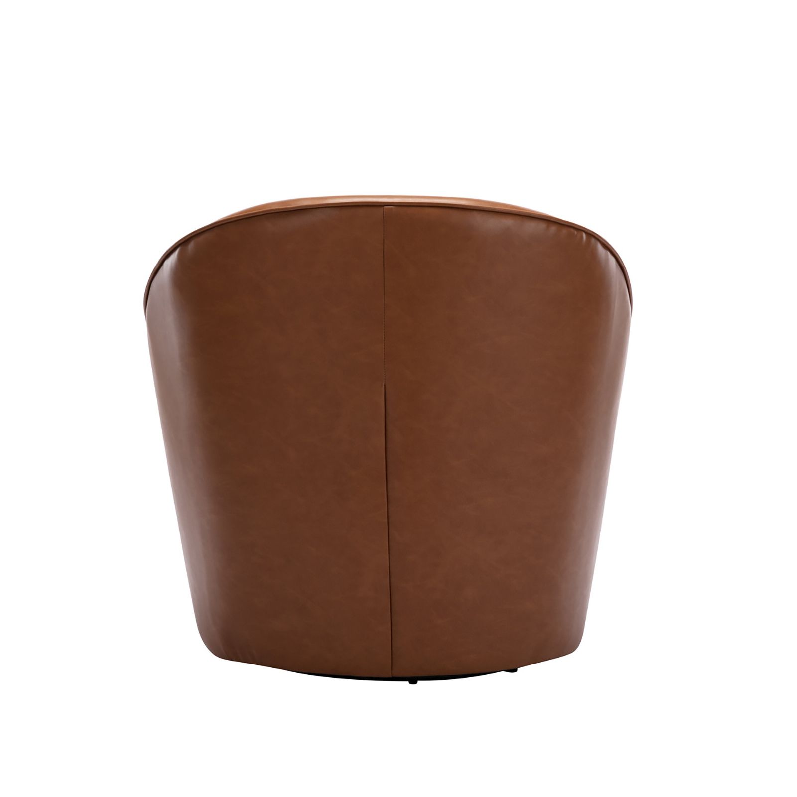 Add a touch of warmth and sophistication to any space with the Caramel Swivel Chair. This stylish accent chair features smooth faux leather in a rich caramel brown hue, complemented by modern angled arms and a sleek swivel base for effortless movement. Designed with comfort in mind, it includes a high-density foam seat cushion that offers lasting support. Easy to maintain and effortlessly chic, it's the perfect blend of form and function.