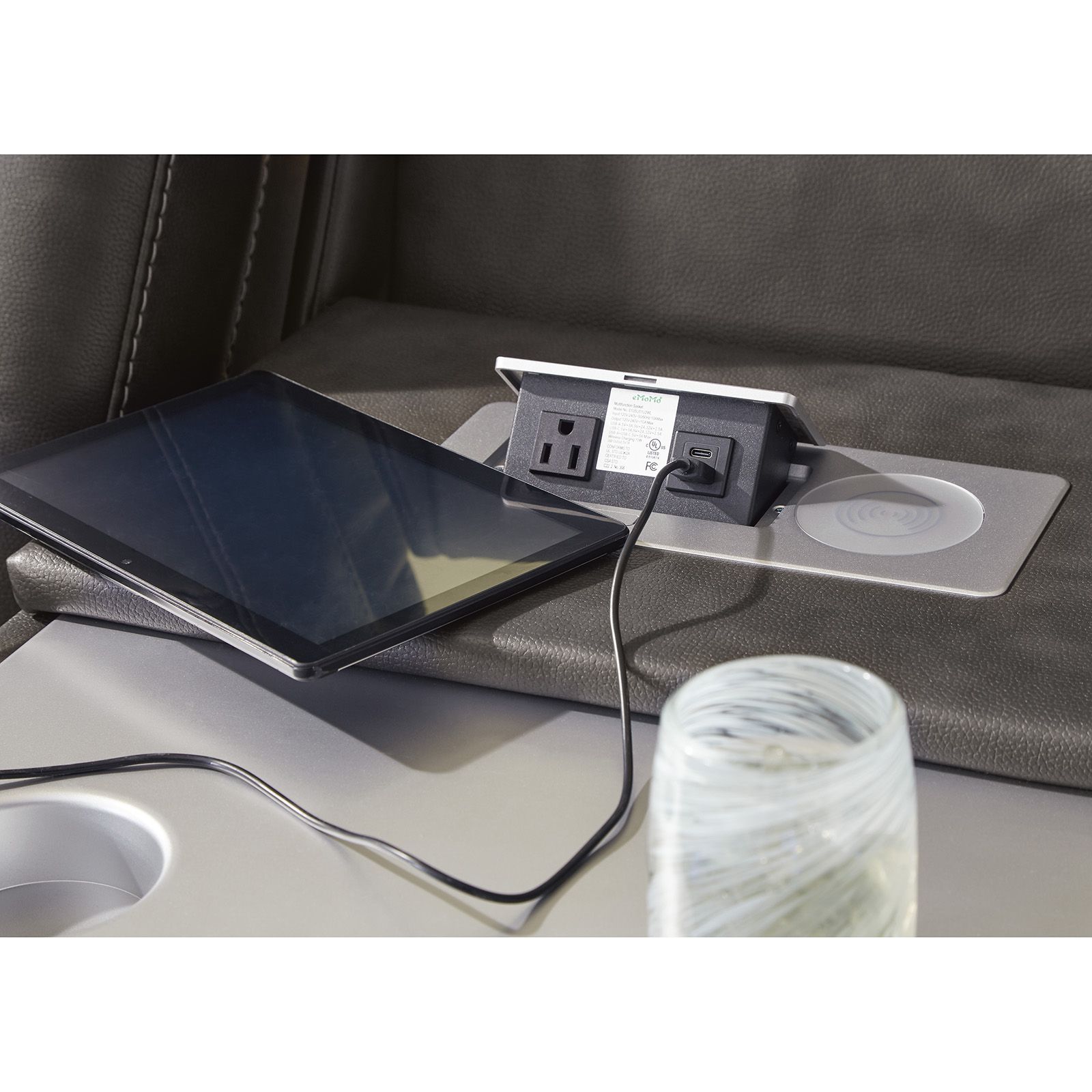 The Fyne-Dyme Shadow Power Recliner brings modern style and high-tech comfort to your living space. Wrapped in gray faux leather with diamond stitching and streamlined arms, it offers one-touch power reclining, adjustable headrests, and plush foam cushions for lasting support. Flip-top storage arms with cup holders keep essentials close, while ambient blue LED base lighting sets the mood for movie nights or gaming. Designed with a sturdy frame and energy-saving USB technology, it’s the perfect blend of function, durability, and sleek sophistication.