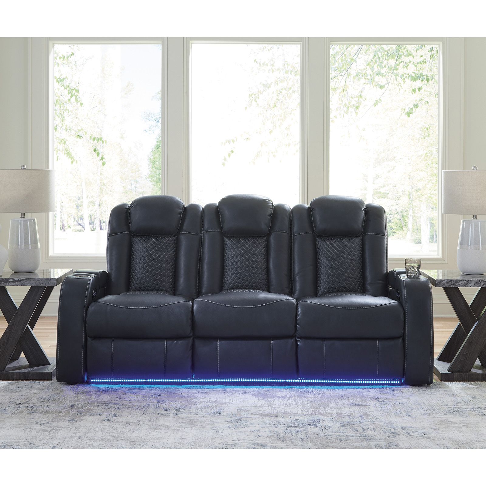 The Fine-Dyme Shadow Power Recliner Sofa blends high-tech convenience with sleek style. Upholstered in gray faux leather with diamond stitching, it offers one-touch power reclining, adjustable headrests, and plush foam cushions for comfort. USB ports, cup holders, storage arms, and a drop-down table with wireless charging keep essentials close, while blue LED base lighting creates a theater-style vibe—perfect for movie nights, gaming, or everyday lounging.