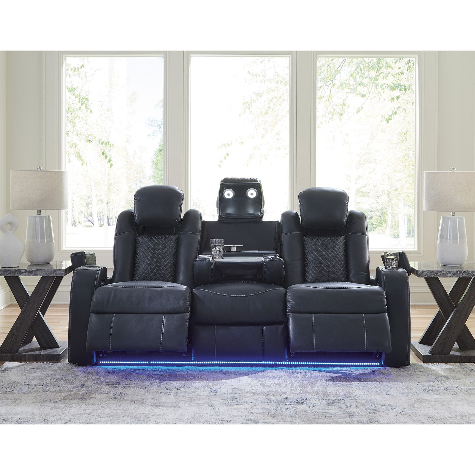 The Fyne-Dyme Shadow Power Recliner Console Loveseat combines sleek style with high-tech comfort. Upholstered in gray faux leather with diamond stitching, it offers one-touch power reclining, adjustable headrests, and plush foam cushions. Built-in audio with wireless connectivity, console controls, and blue LED base lighting turn your living room into a theater-like escape. With storage arms, cup holders, and a center console, everything you need stays within reach—perfect for movie nights, gaming, or everyday lounging.
