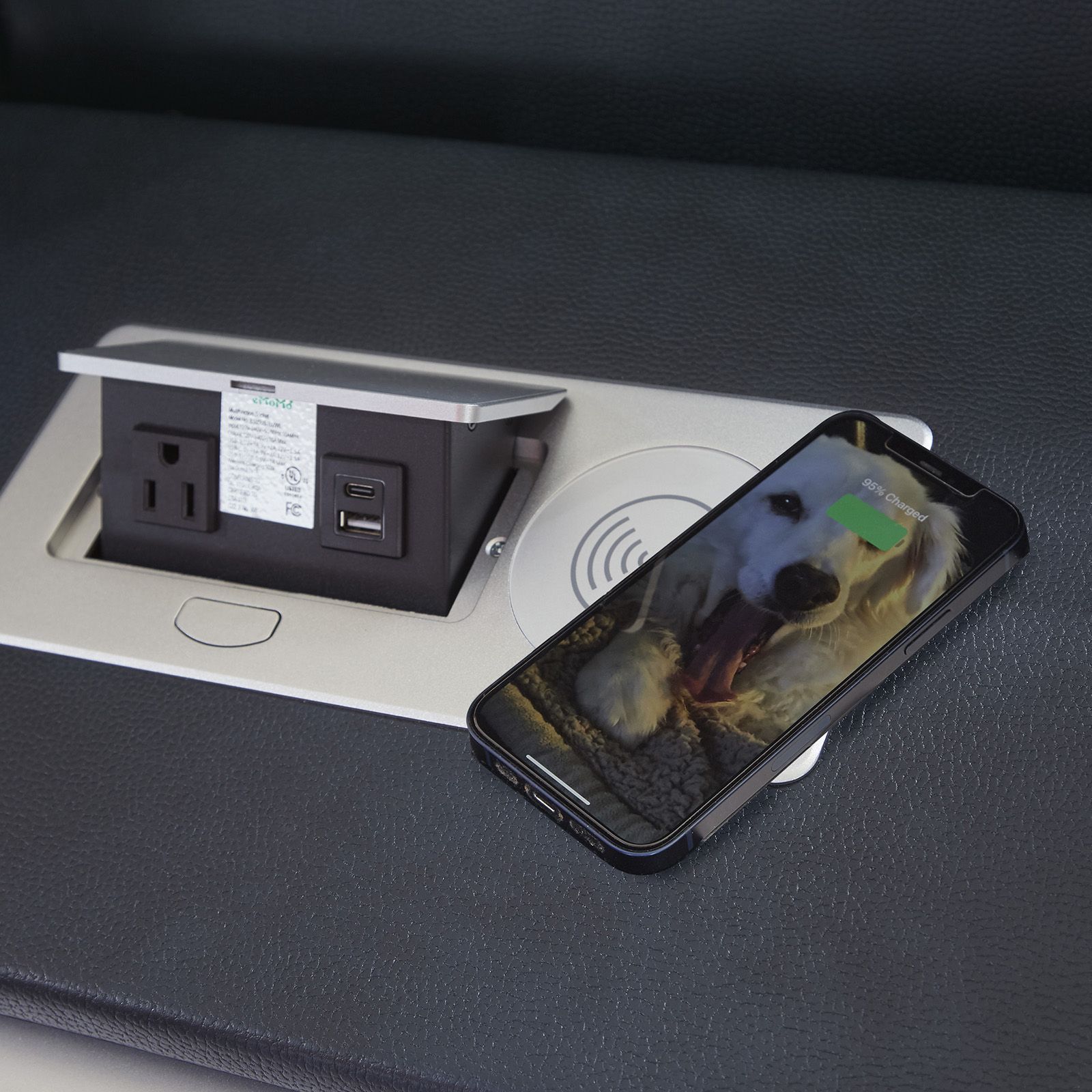 The Fyne-Dyme Shadow Power Recliner brings modern style and high-tech comfort to your living space. Wrapped in gray faux leather with diamond stitching and streamlined arms, it offers one-touch power reclining, adjustable headrests, and plush foam cushions for lasting support. Flip-top storage arms with cup holders keep essentials close, while ambient blue LED base lighting sets the mood for movie nights or gaming. Designed with a sturdy frame and energy-saving USB technology, it’s the perfect blend of function, durability, and sleek sophistication.