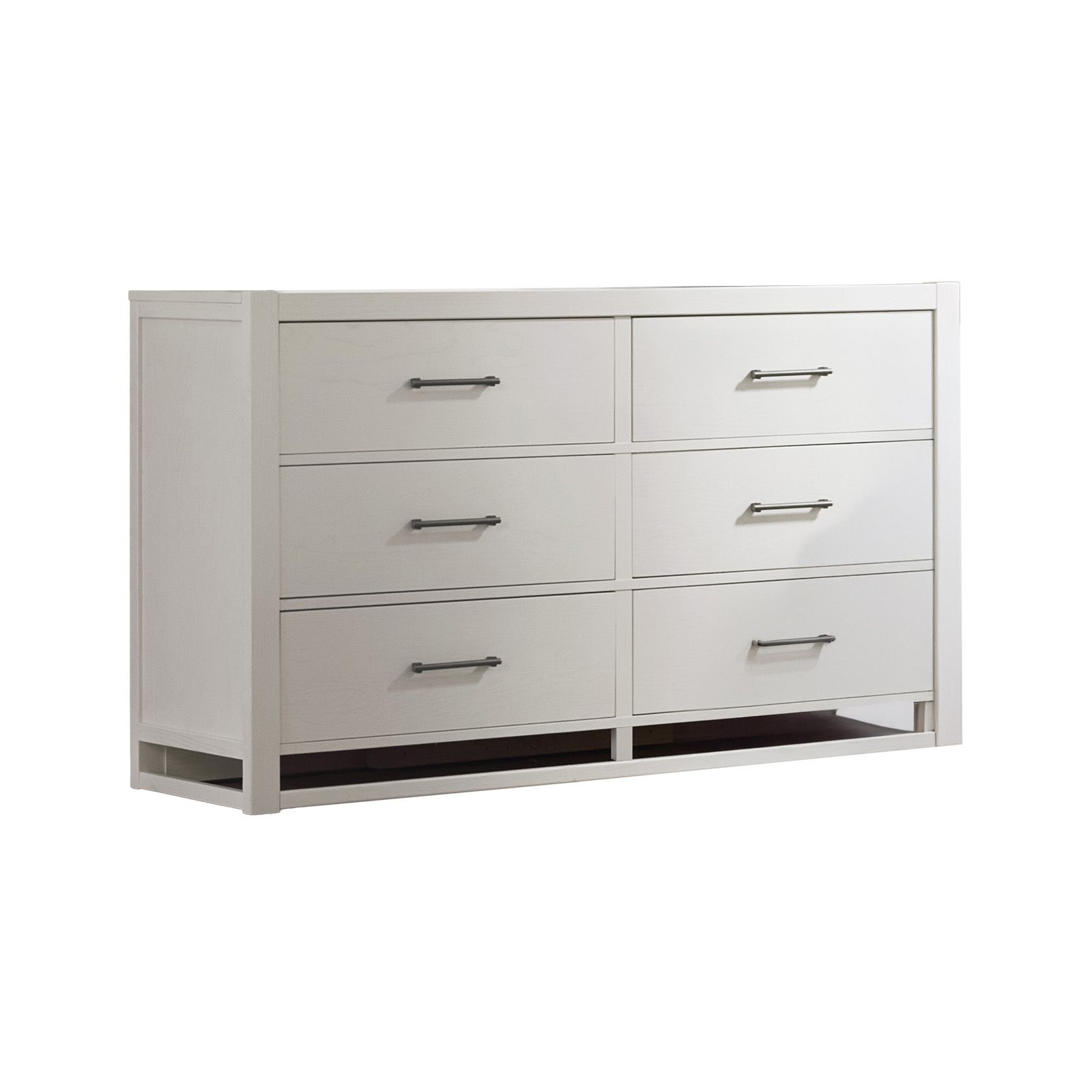 The Lodge & Loft Soft White Chest by Vaughan-Bassett pairs rustic oak beauty with clean, modern lines for a timeless look. Proudly made in the USA from solid American oak and oak veneers, the soft white finish highlights the wood’s natural grain and character. Five spacious drawers feature smooth undermounted ball-bearing guides, acrylic drawer sides and bottoms, and French dovetail joinery for lasting durability. Completed with custom hardware, a distinctive bottom stretcher, and strong mortise construction, this chest offers refined storage with enduring style.