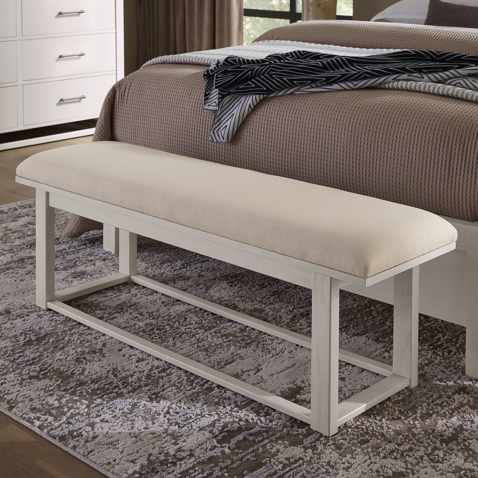 The Lodge & Loft Soft White Chest by Vaughan-Bassett pairs rustic oak beauty with clean, modern lines for a timeless look. Proudly made in the USA from solid American oak and oak veneers, the soft white finish highlights the wood’s natural grain and character. Five spacious drawers feature smooth undermounted ball-bearing guides, acrylic drawer sides and bottoms, and French dovetail joinery for lasting durability. Completed with custom hardware, a distinctive bottom stretcher, and strong mortise construction, this chest offers refined storage with enduring style.