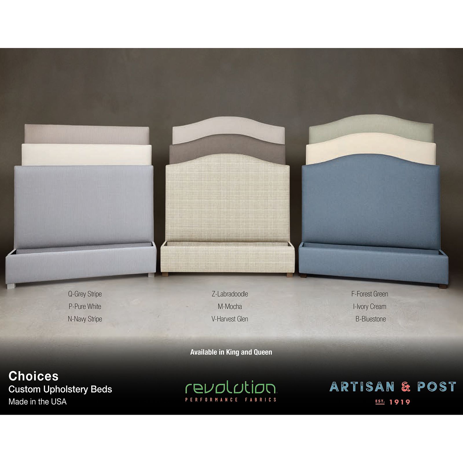 The Emily Bluestone Upholstered Queen Headboard adds soft elegance with its arched silhouette and blue Revolution Performance fabric for a durable, sophisticated look. Solid oak legs are included in three finishes—espresso, natural, and soft white—and the headboard weighs 56 lbs. Made in the U.S.A. by Artisan & Post as part of the Choices Custom Collection, Vaughan Bassett plants a tree for every one used. Queen headboard only; rails and footboard can be ordered at a local store.