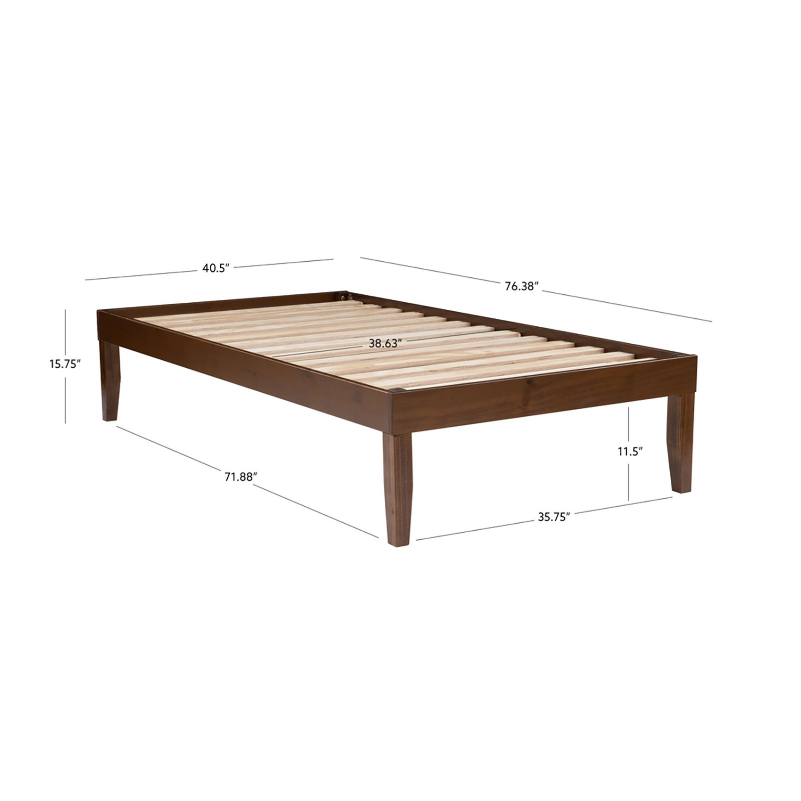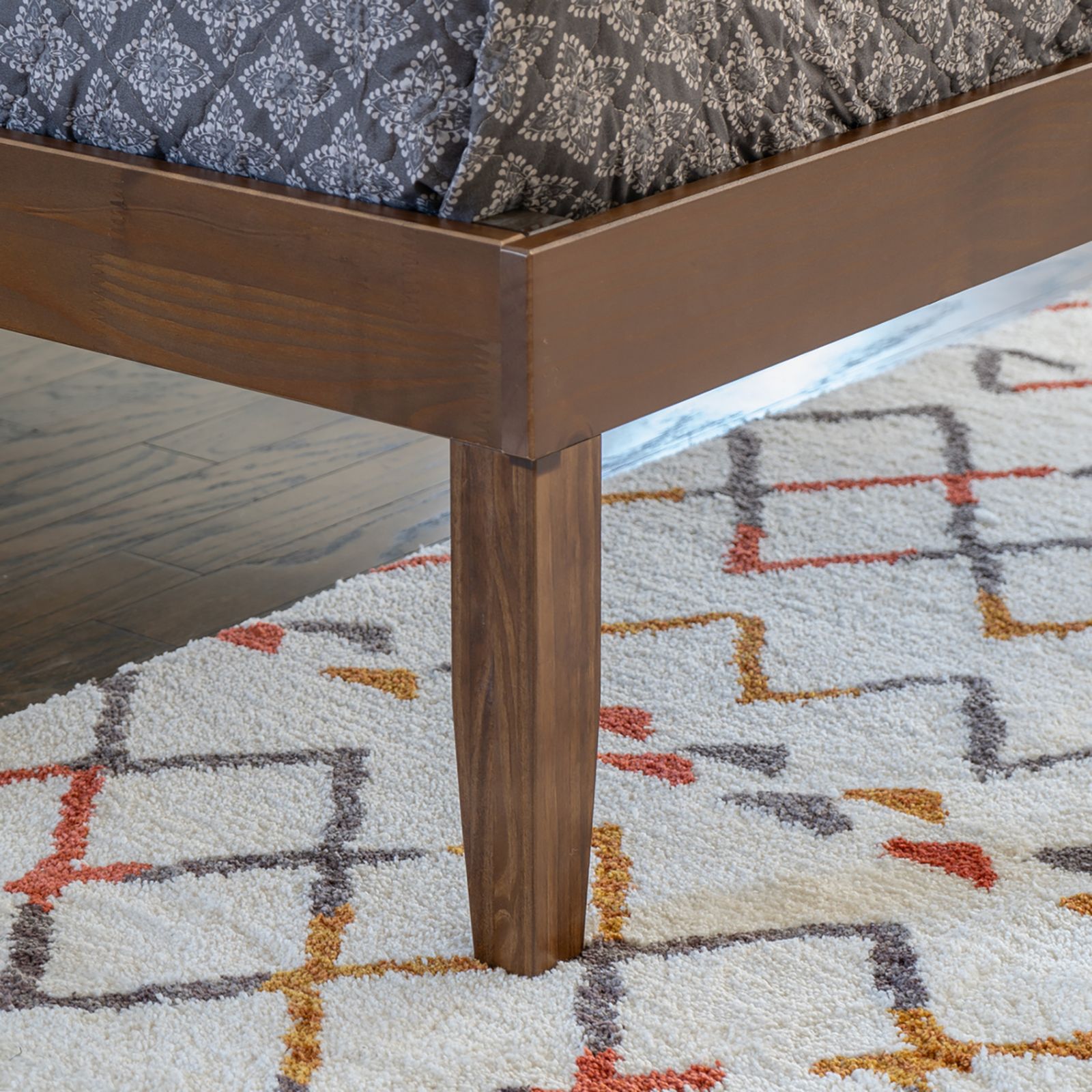 Elevate your bedroom with the perfect blend of style and function! This chic full size platform bed brings a touch of contemporary sophistication to your space while keeping it warm and inviting. Crafted from solid pine wood and finished in a rich walnut hue, it’s as durable as it is beautiful, featuring a UV coating that stands up to everyday spills and stains. The tapered legs and clean lines evoke a timeless midcentury modern vibe that effortlessly complements any decor. Style, practicality, and sophistication—this bed frame has it all.