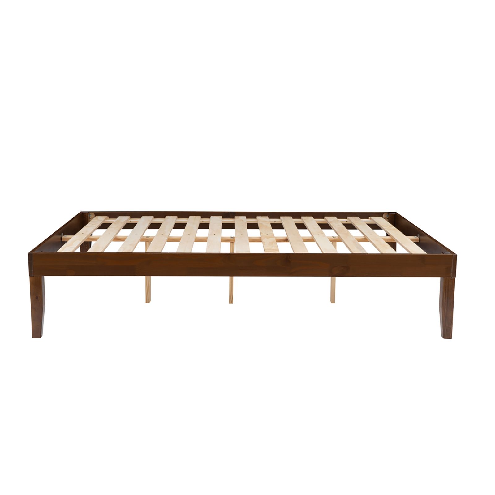 Elevate your bedroom with the perfect blend of style and function! This chic queen platform bed brings a touch of contemporary sophistication to your space while keeping it warm and inviting. Crafted from solid pine wood and finished in a rich walnut hue, it’s as durable as it is beautiful, featuring a UV coating that stands up to everyday spills and stains. The tapered legs and clean lines evoke a timeless midcentury modern vibe that effortlessly complements any decor. Style, practicality, and sophistication—this bed frame has it all.