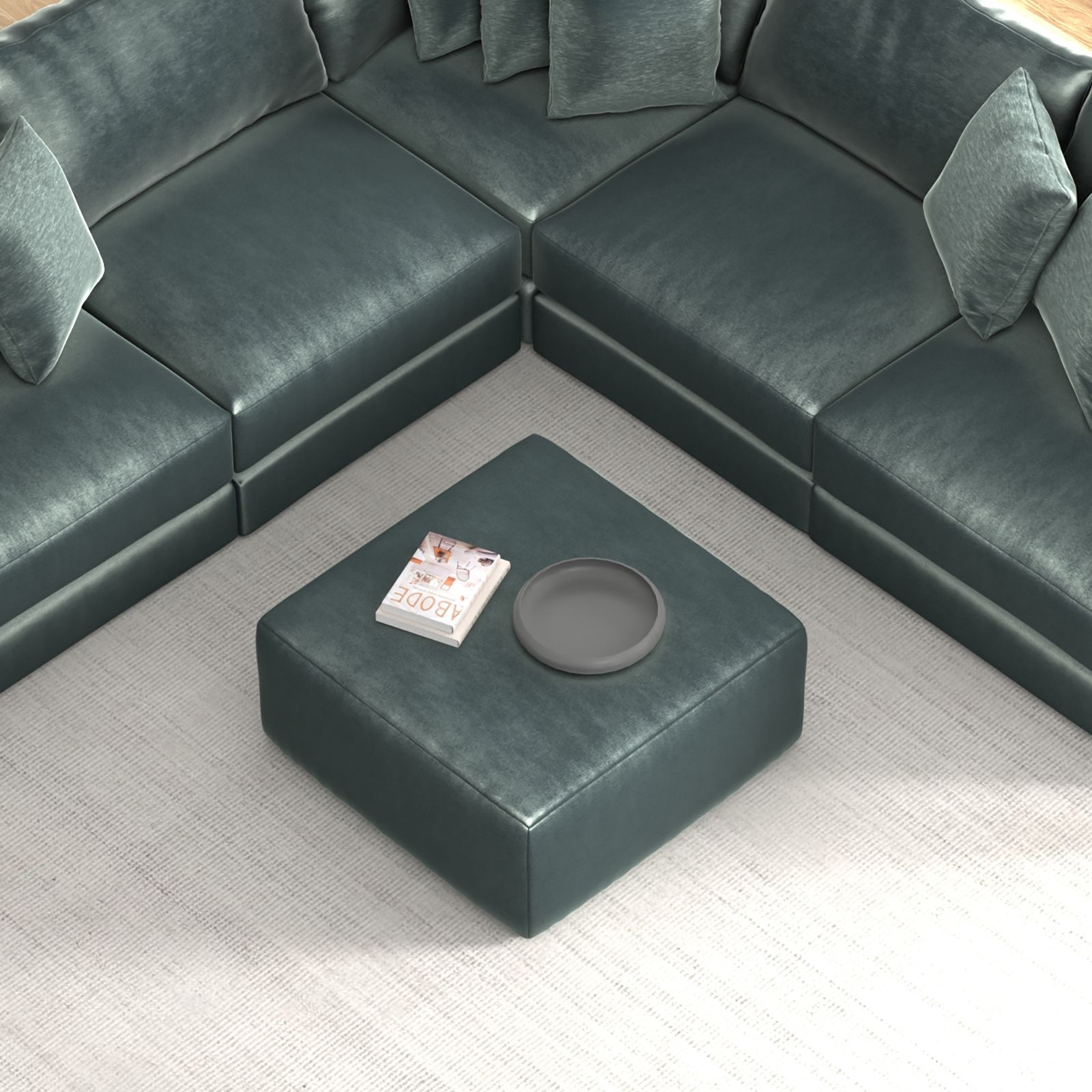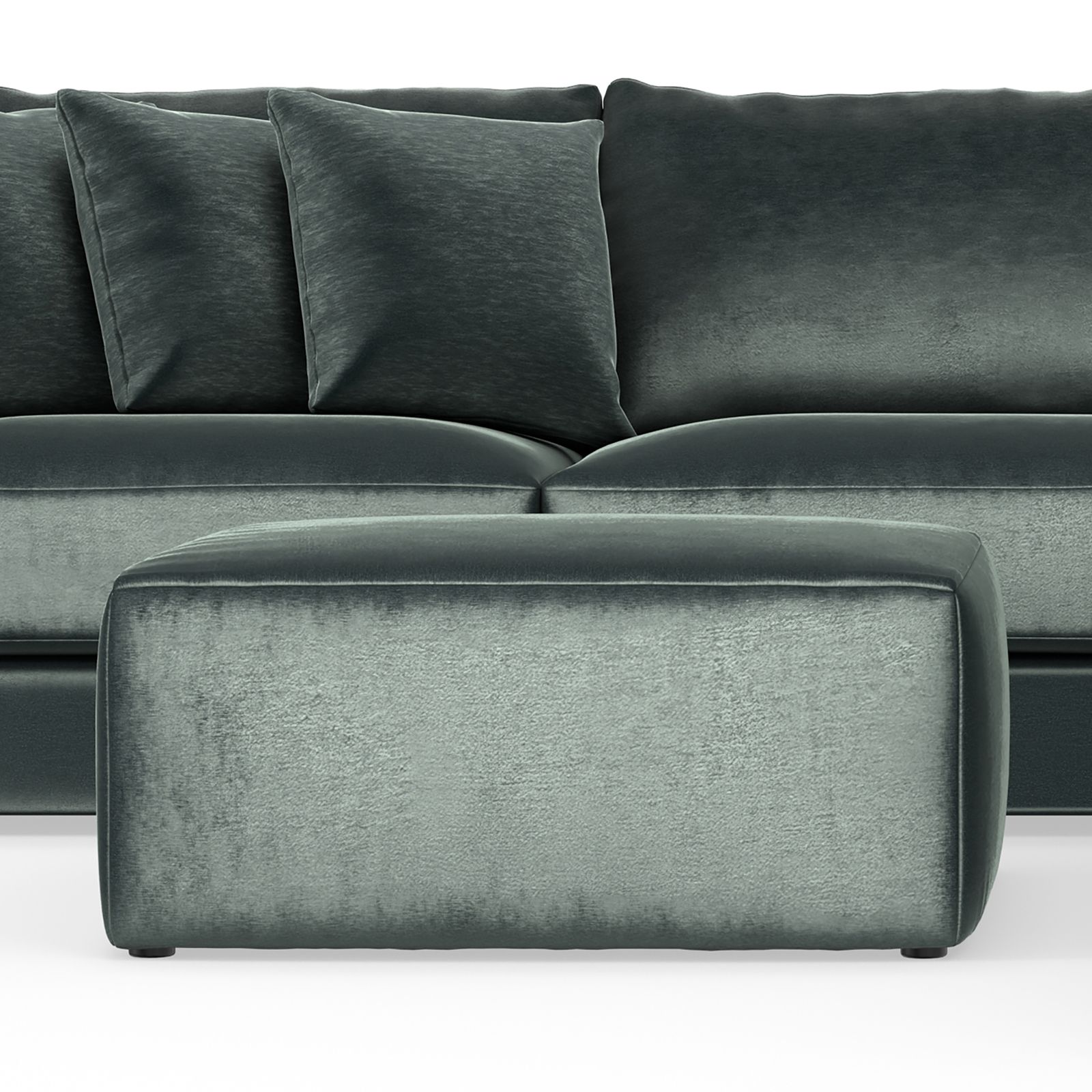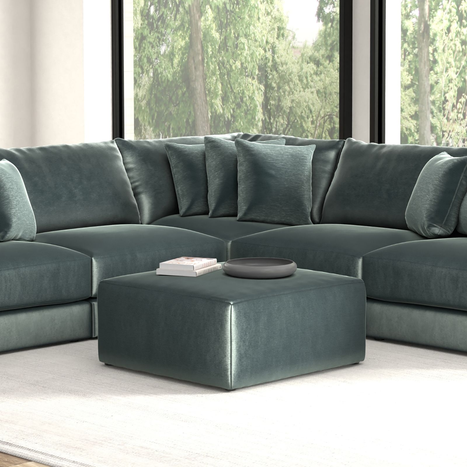 The Remington Pine Velvet Ottoman is the perfect companion to your sectional, offering both style and comfort in one elegant piece. Upholstered in luxurious pine green velvet with soft shades of green, this cocktail ottoman adds a touch of sophistication to any living space. Crafted in the U.S. with 100% polyester fabric and built for lasting durability, it features a limited lifetime warranty on the frame and springs for peace of mind.