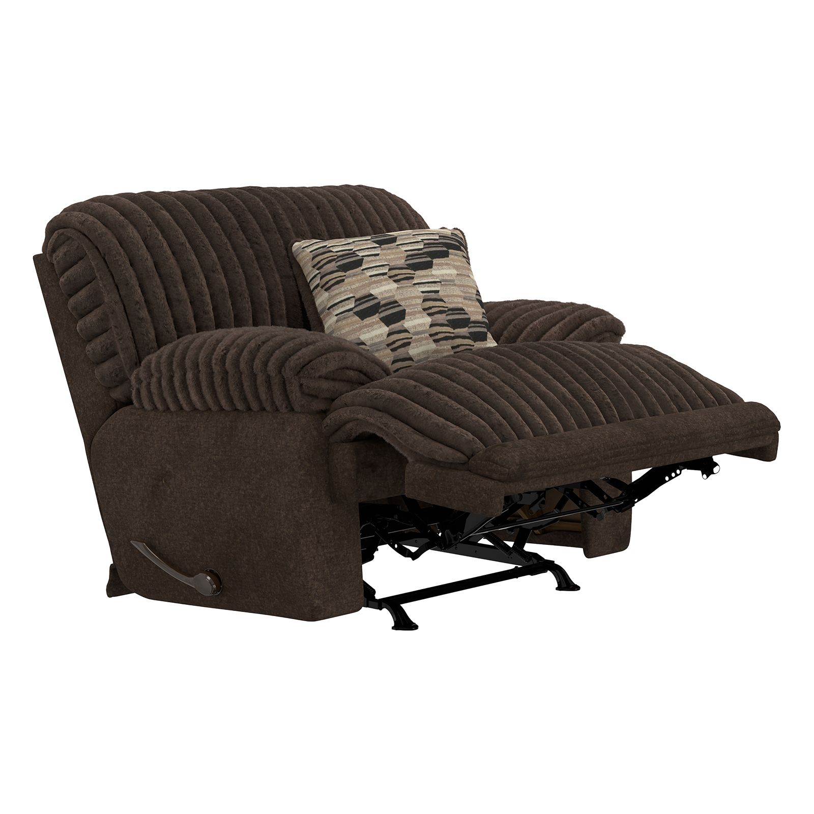 The Hollifield Chocolate Recliner Loveseat offers plush comfort and timeless style. Upholstered in soft, luxurious faux fur with a wide corduroy texture, this rich chocolate brown loveseat features deep chaise seating, a classic pub back, and four cozy throw pillows. Easily recline with manual handles on each side and enjoy lasting support from Comfort Coil Spring seating with gel-infused, high-resiliency foam. Built with a durable steel seat box and backed by a limited lifetime warranty, it’s comfort and quality you can count on.