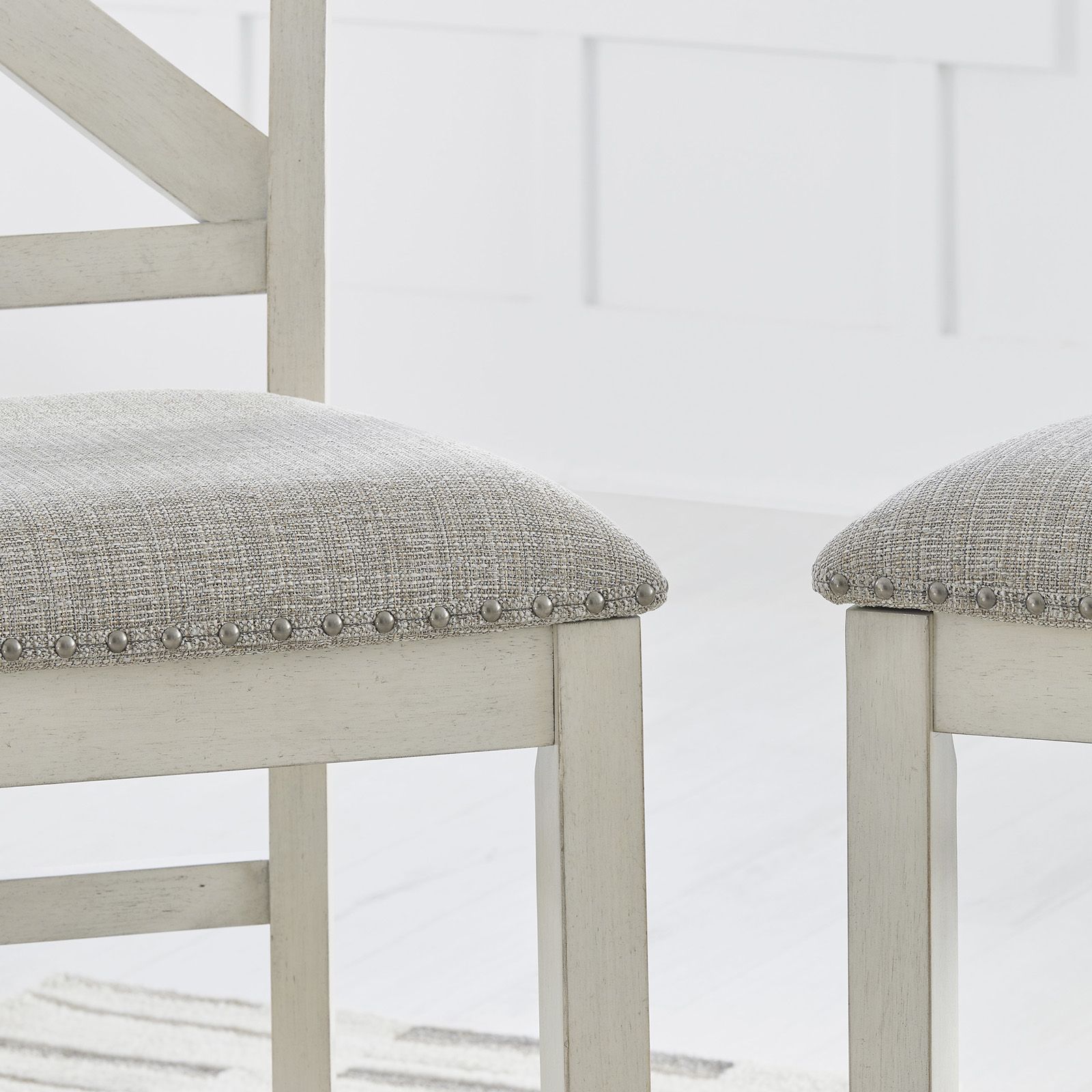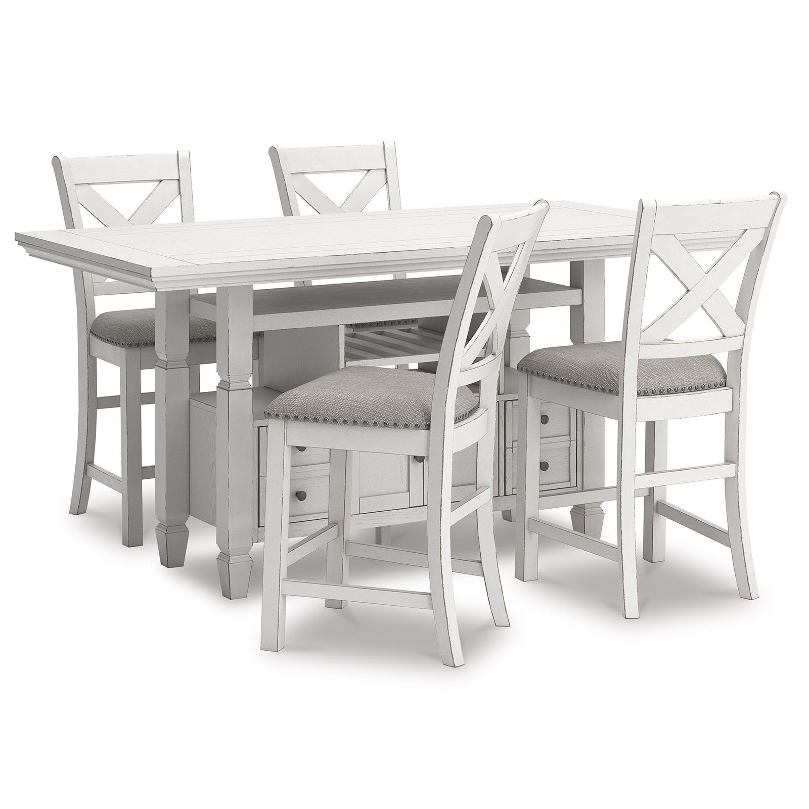 Bring casual charm and functional style to your dining space with the Robbinsdale 5-Piece Counter Height Dining Set. Featured in an antiqued white finish with a natural wood grain texture, this set offers a warm farmhouse feel with a fashionable twist. The counter-height table provides everyday convenience with two pass-through drawers, a lower door cabinet accessible from both sides, and dual 10-bottle wine storage shelves—one reversible for flexibility. Complementing the table, four matching stools feature light gray polyester upholstery, foam-cushioned seats, nailhead trim, and X-style backs for a timeless, inviting look perfect for family gatherings or casual entertaining.