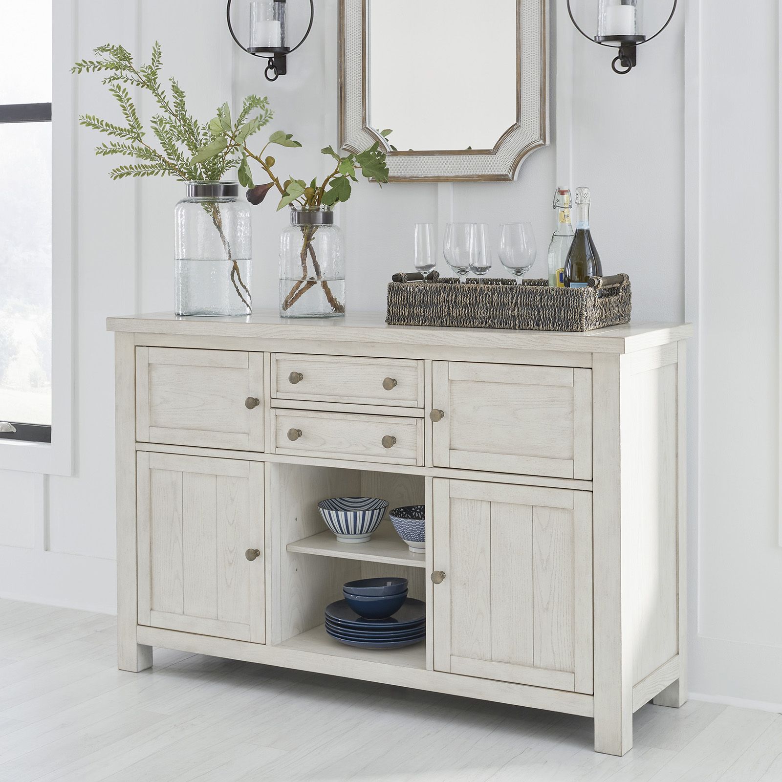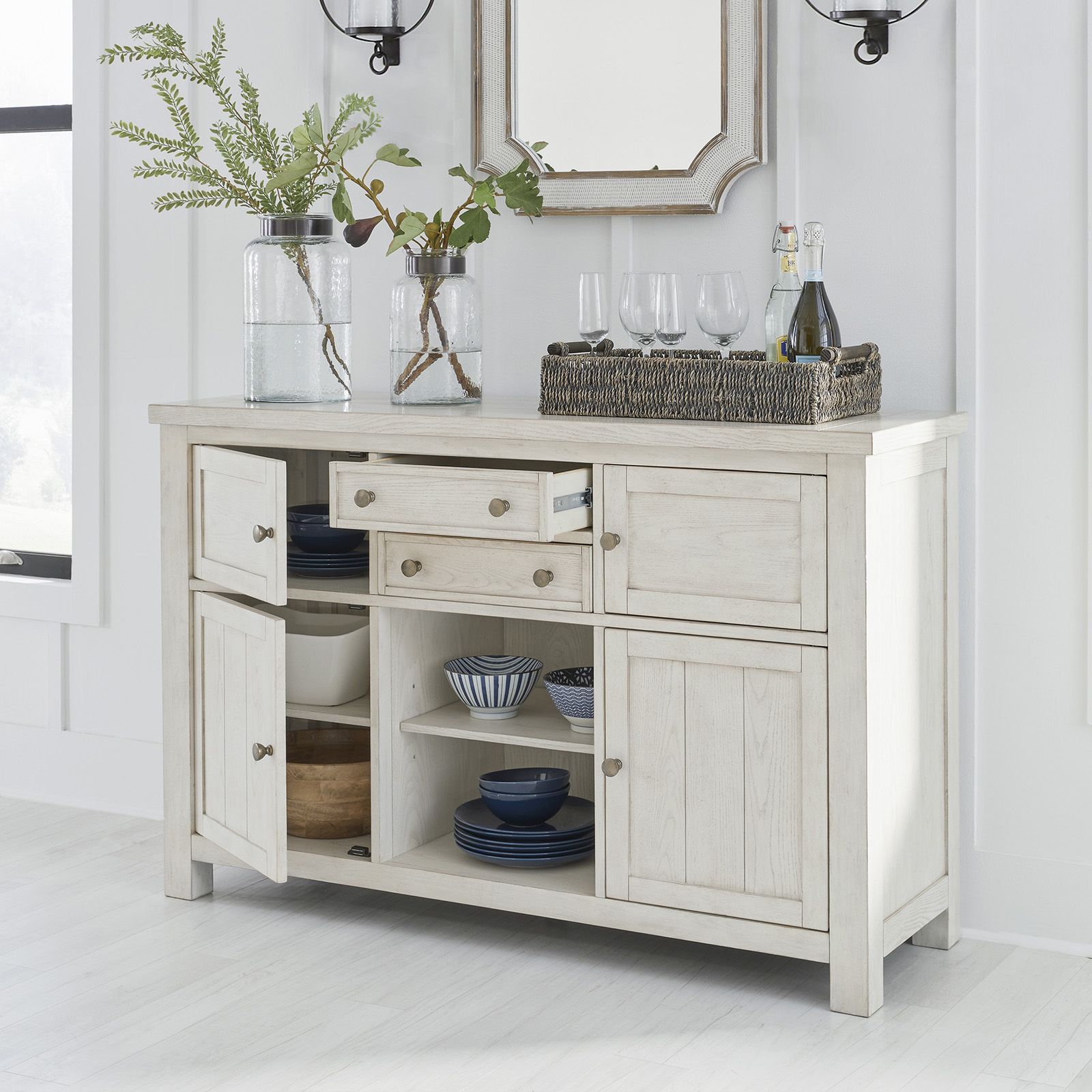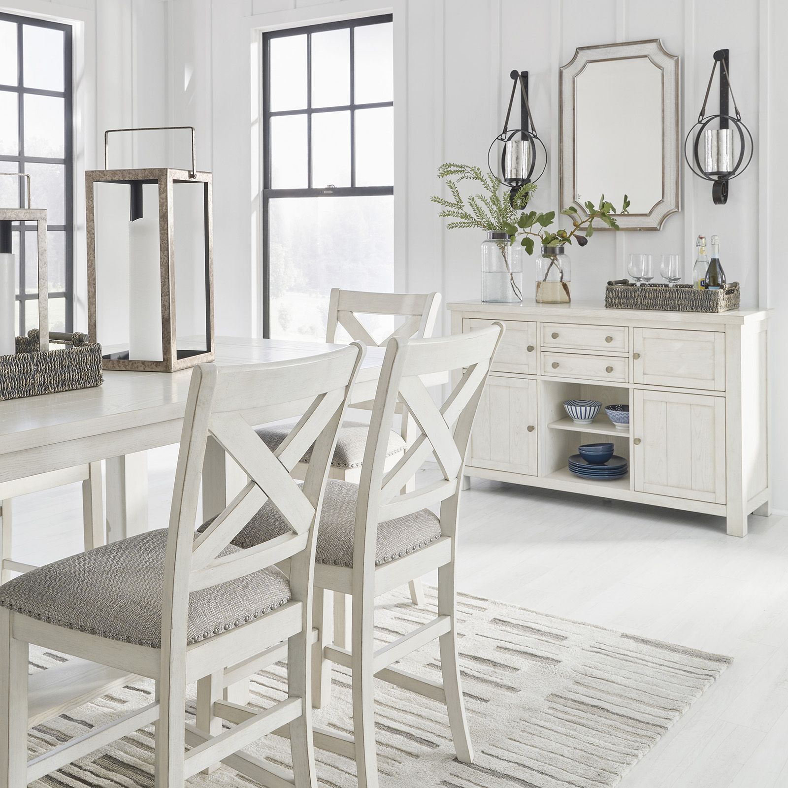 Bring casual charm and functional style to your dining space with the Robbinsdale 5-Piece Counter Height Dining Set. Featured in an antiqued white finish with a natural wood grain texture, this set offers a warm farmhouse feel with a fashionable twist. The counter-height table provides everyday convenience with two pass-through drawers, a lower door cabinet accessible from both sides, and dual 10-bottle wine storage shelves—one reversible for flexibility. Complementing the table, four matching stools feature light gray polyester upholstery, foam-cushioned seats, nailhead trim, and X-style backs for a timeless, inviting look perfect for family gatherings or casual entertaining.