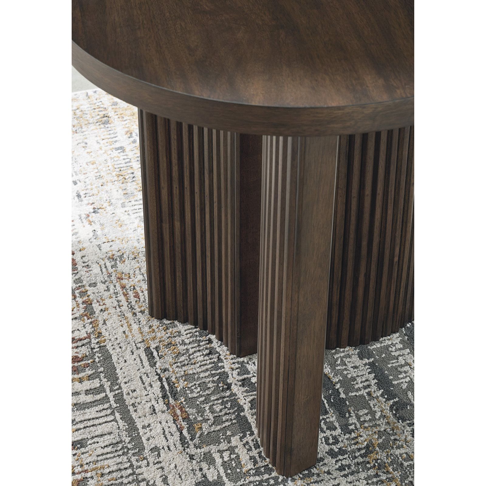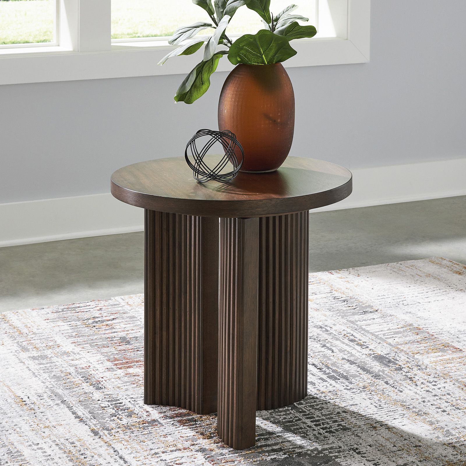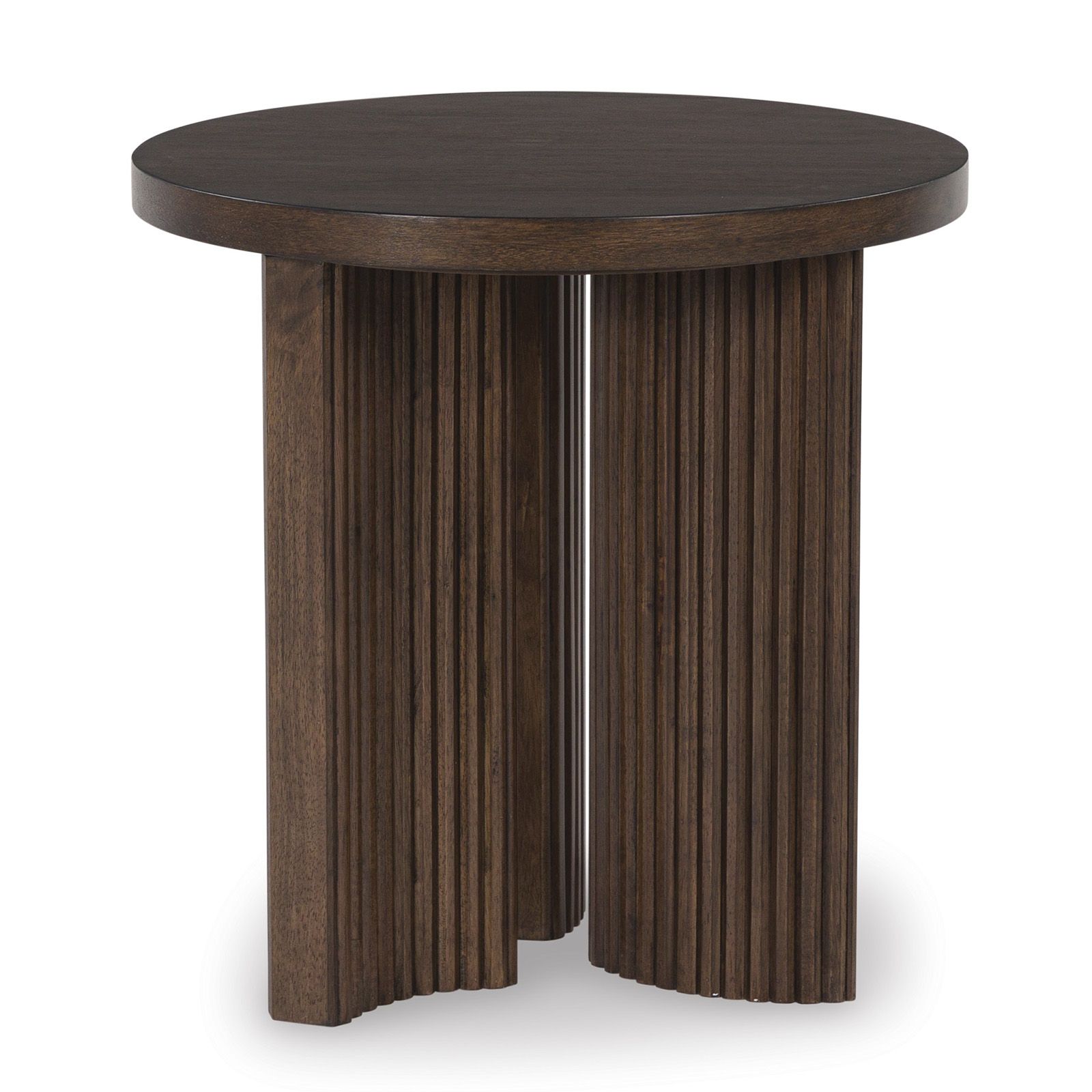 The Korestone Round End Table brings casual contemporary style with an urban vibe to any space. Crafted from hardwood solids and veneers, it features a warm brown finish and a thick tabletop that highlights décor with sleek simplicity. The trend-forward reeded base adds a subtle nod to mid-century modern design, creating a beautifully balanced piece that reflects an easy, elegant sensibility.