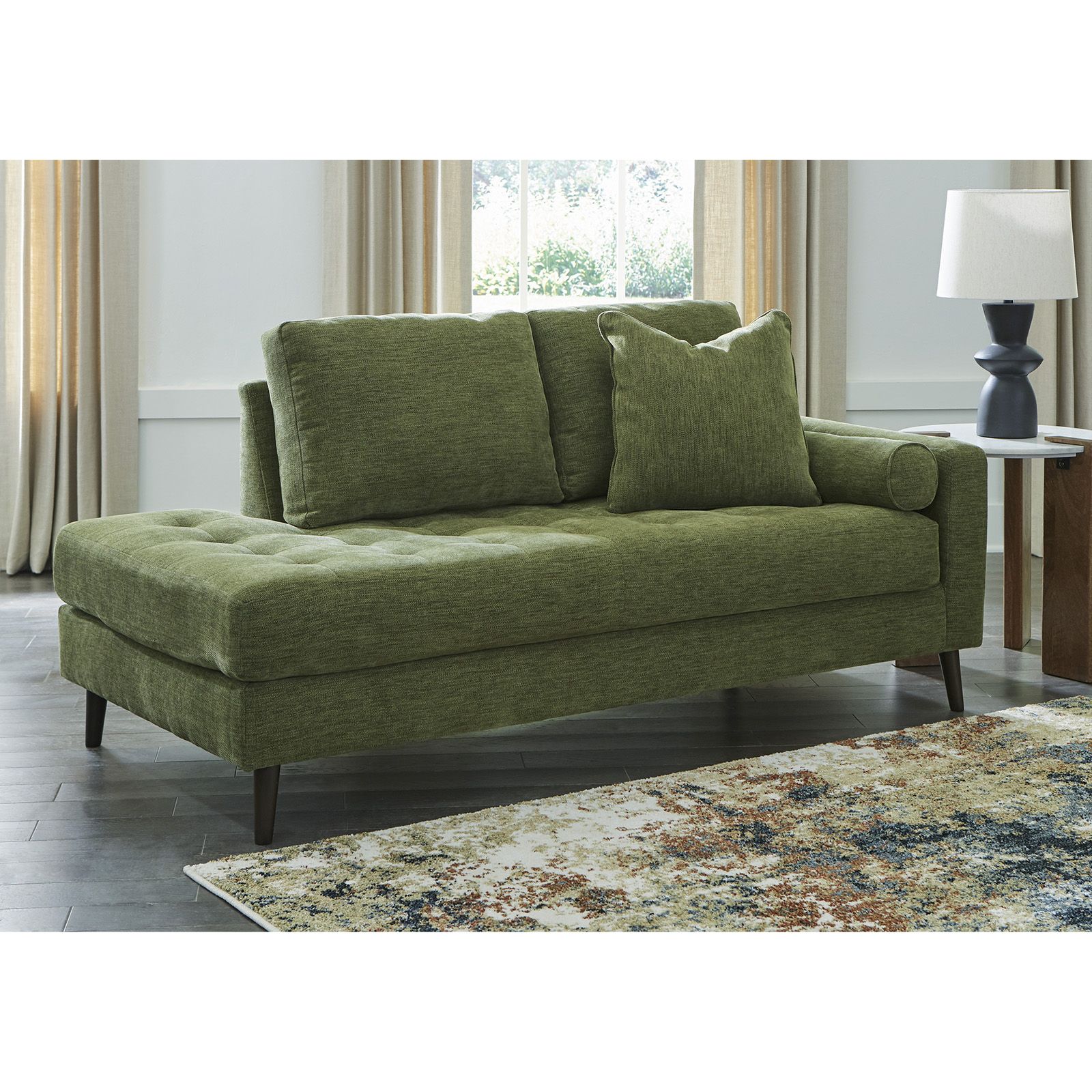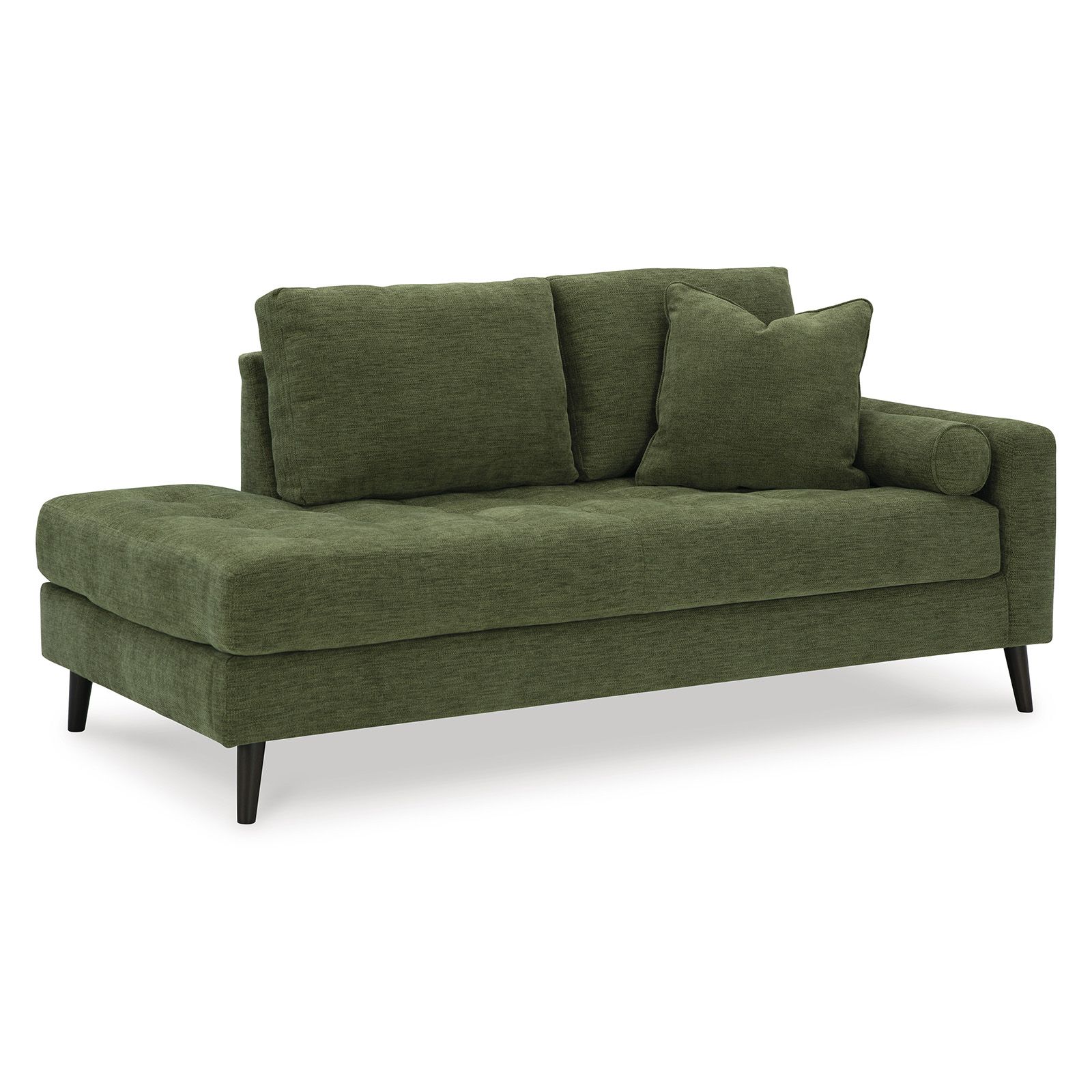 Feed your mid-century modern nostalgia with the Bixler Olive Loveseat—a timeless design refreshed for today’s living. Upholstered in a rich olive green polyester-viscose blend, this sofa pairs vintage-inspired charm with everyday comfort. Its clean, linear profile and tapered accent legs give it a sleek, retro silhouette, while button-tufted back cushions add a tailored finishing touch. Built with a corner-blocked frame for lasting durability, it’s the perfect spot to relax in style.
