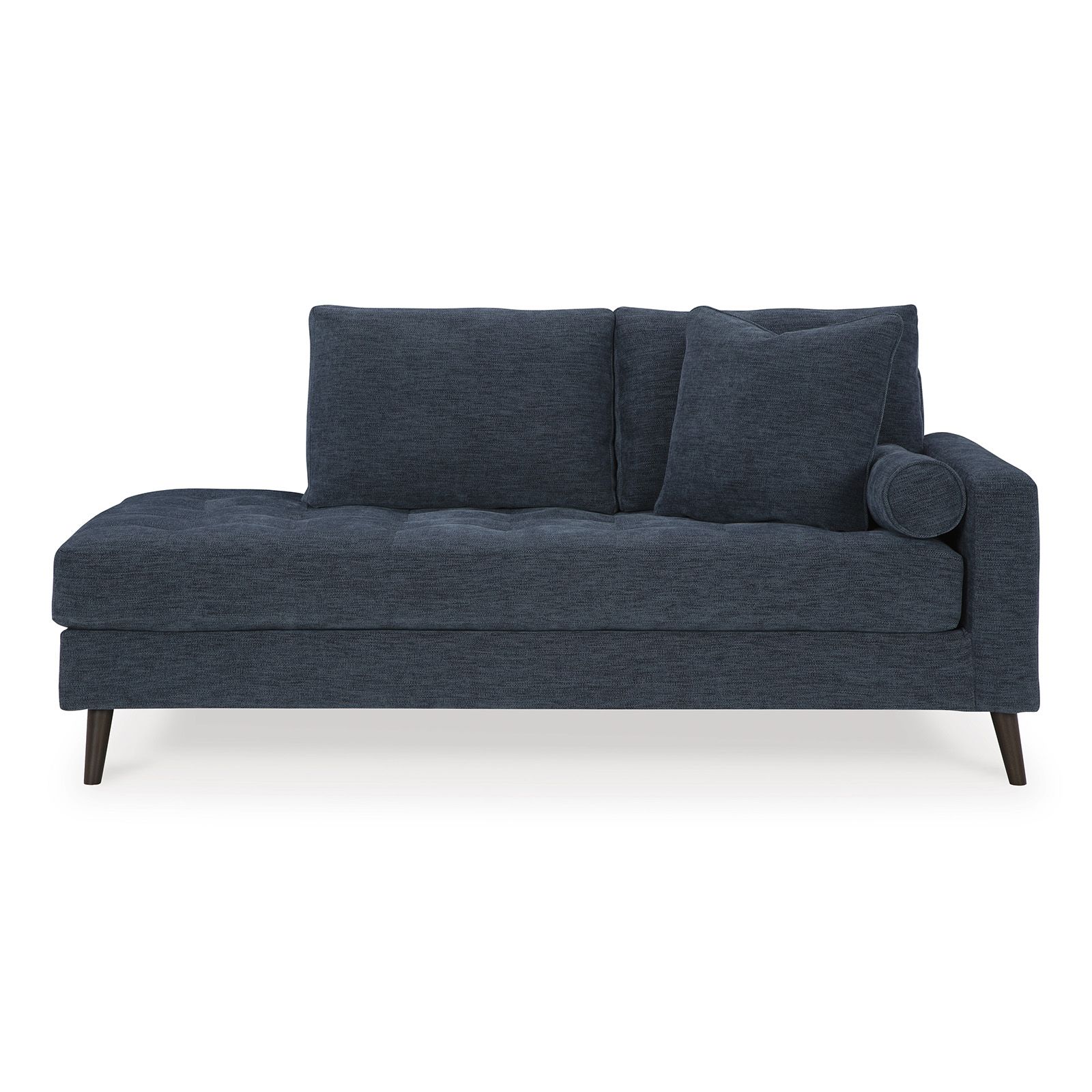 The Bixler Olive Chaise invites you to unwind in mid-century modern style with a fresh, contemporary twist. Draped in a rich olive green polyester-viscose blend, this right-arm-facing chaise offers a perfect balance of comfort and design. Its linear profile and tapered accent legs create a sleek, retro-inspired silhouette, while the button-tufted seat cushion and included accent pillow add a tailored touch. Built with a durable corner-blocked frame and high-quality foam cushions, it’s an effortlessly stylish spot to stretch out and relax.