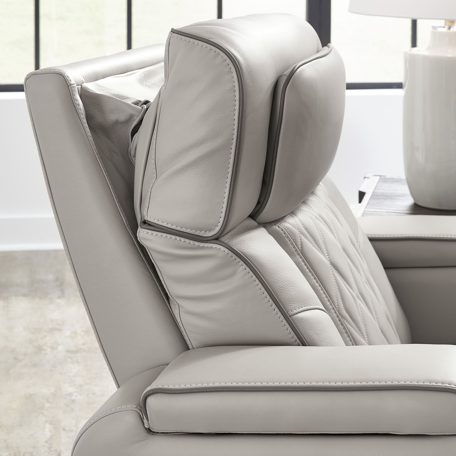 The Boyington Gray Leather Power Recliner Sofa delivers luxurious comfort with smart, modern features. Upholstered in top-grain leather on the inside with matched faux leather on the back and sides. Power reclining with zero-gravity positioning, an adjustable headrest, extended footrest, and built-in massage with heat make relaxing effortless, while ambient LED lighting, USB charging, flip-top arm storage, cup holders, and a drop-down table with wireless charging add everyday convenience.