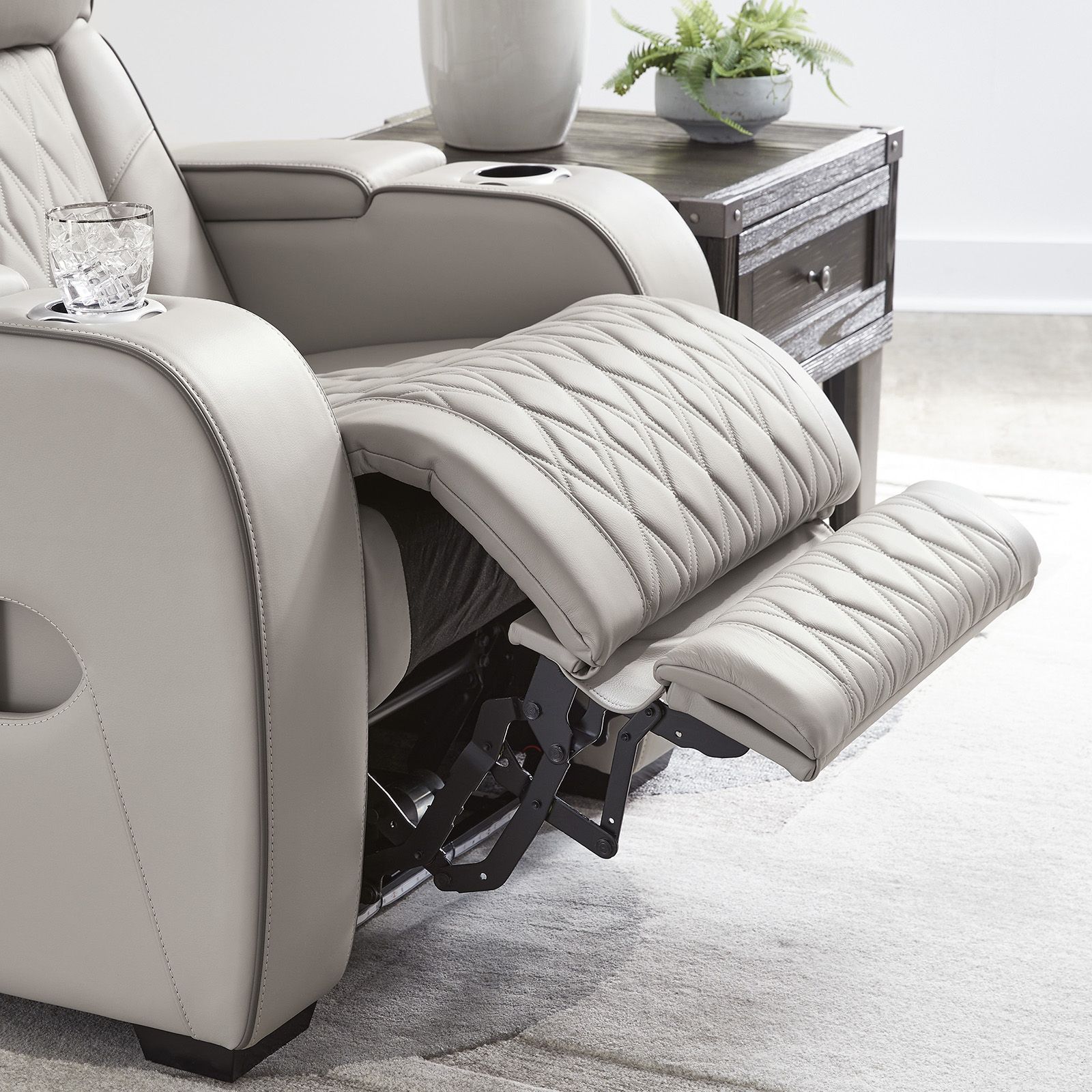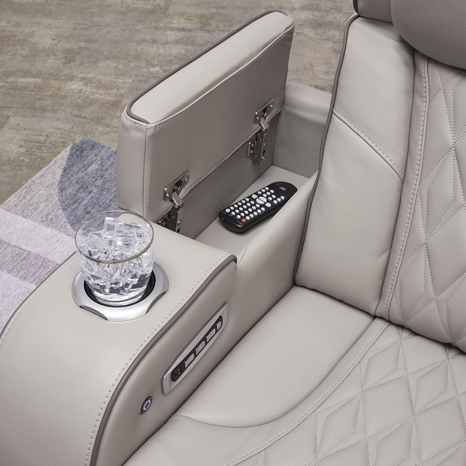 The Boyington Gray Leather Power Recliner Console Loveseat delivers sleek style and advanced comfort in a light gray design with diamond stitching. Top-grain leather covers the inside seating areas, with matched faux leather on the back and sides. Power reclining with zero-gravity positioning, an adjustable headrest, extended footrest, and massage with heat make it easy to relax, while ambient LED lighting, a zero-draw USB port, flip-top arm storage, cup holders, and a center console add everyday convenience.