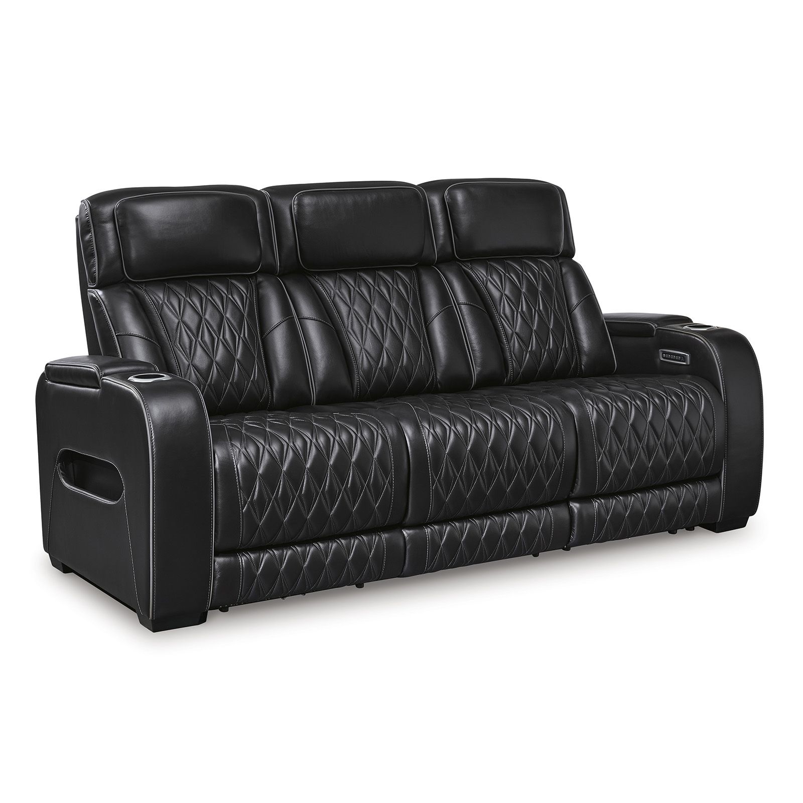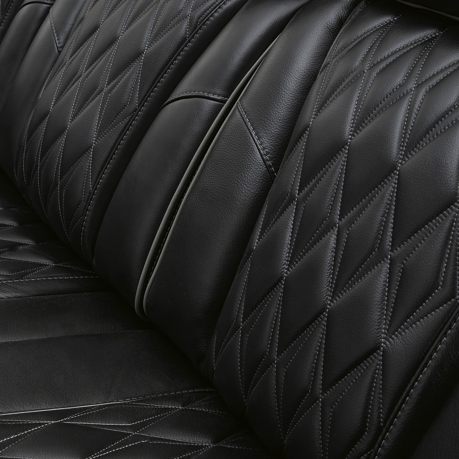 The Boyington Black Leather Power Recliner combines modern style with indulgent comfort. Upholstered in black top-grain leather where you sit, with matching faux leather on the sides and back, it features elegant diamond stitching and natural leather character. Enjoy effortless power reclining with an EasyView adjustable headrest, extended footrest, and zero-gravity positioning, plus air massage, soothing heat, and ambient blue LED lighting. Flip-top arm storage with cup holders and a zero-draw USB port add everyday convenience.