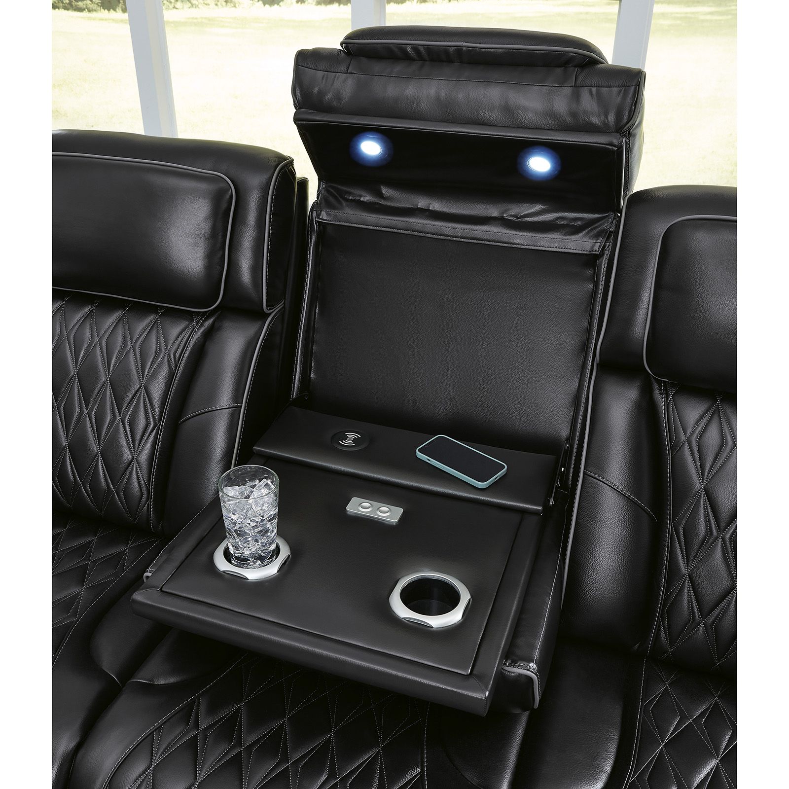 The Boyington Black Leather Power Recliner Console Loveseat delivers sleek style and advanced comfort in a black design with diamond stitching. Top-grain leather covers the inside seating areas, with matched faux leather on the back and sides. Power reclining with zero-gravity positioning, an adjustable headrest, extended footrest, and massage with heat make it easy to relax, while ambient LED lighting, a zero-draw USB port, flip-top arm storage, cup holders, and a center console add everyday convenience.