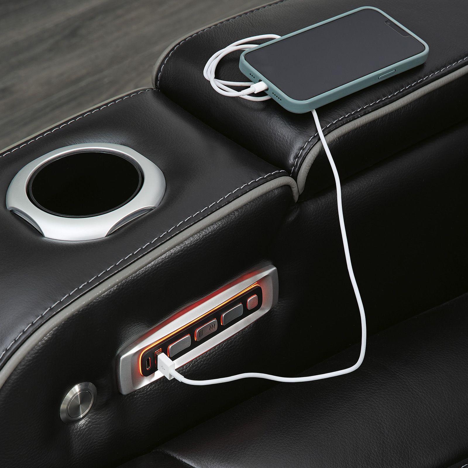 The Boyington Gray Leather Power Recliner Sofa delivers luxurious comfort with smart, modern features. Upholstered in top-grain leather on the inside with matched faux leather on the back and sides. Power reclining with zero-gravity positioning, an adjustable headrest, extended footrest, and built-in massage with heat make relaxing effortless, while ambient LED lighting, USB charging, flip-top arm storage, cup holders, and a drop-down table with wireless charging add everyday convenience.